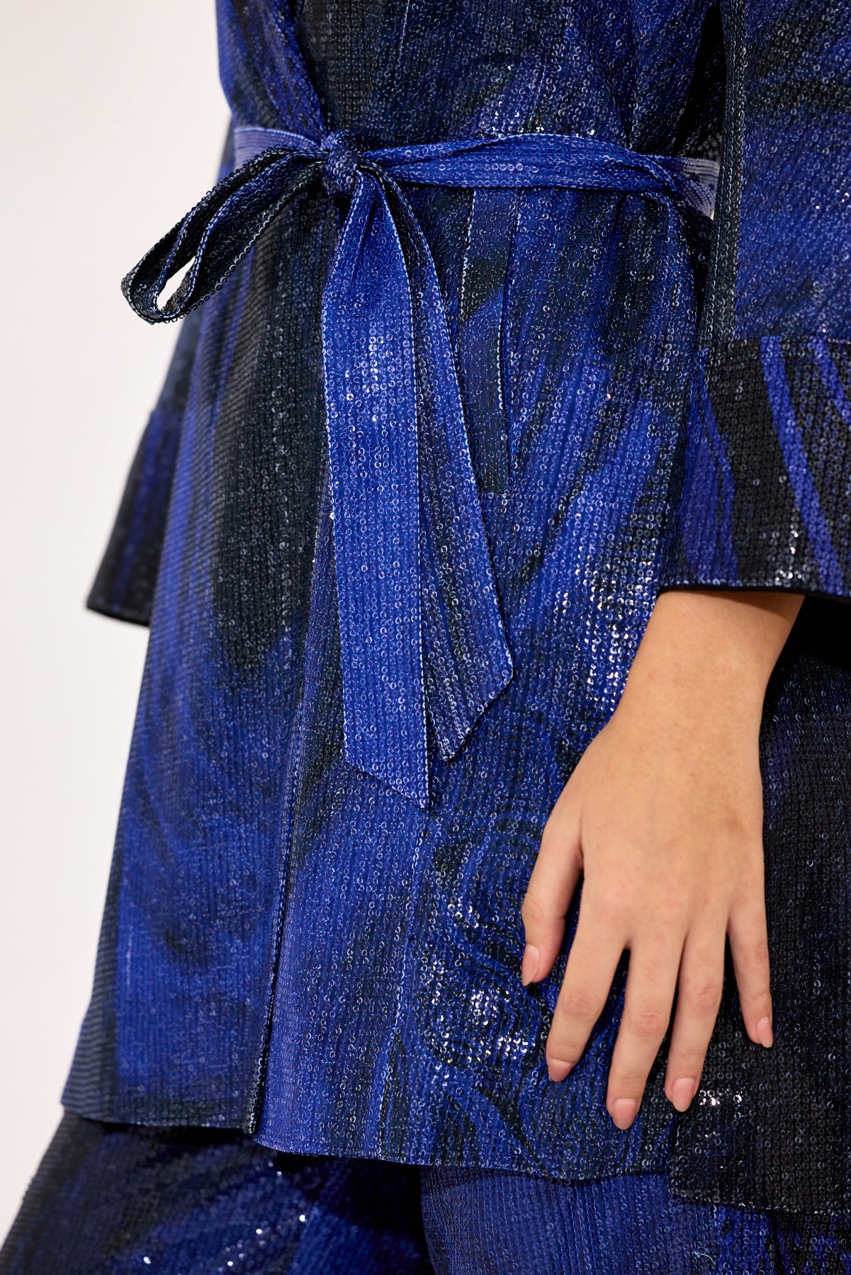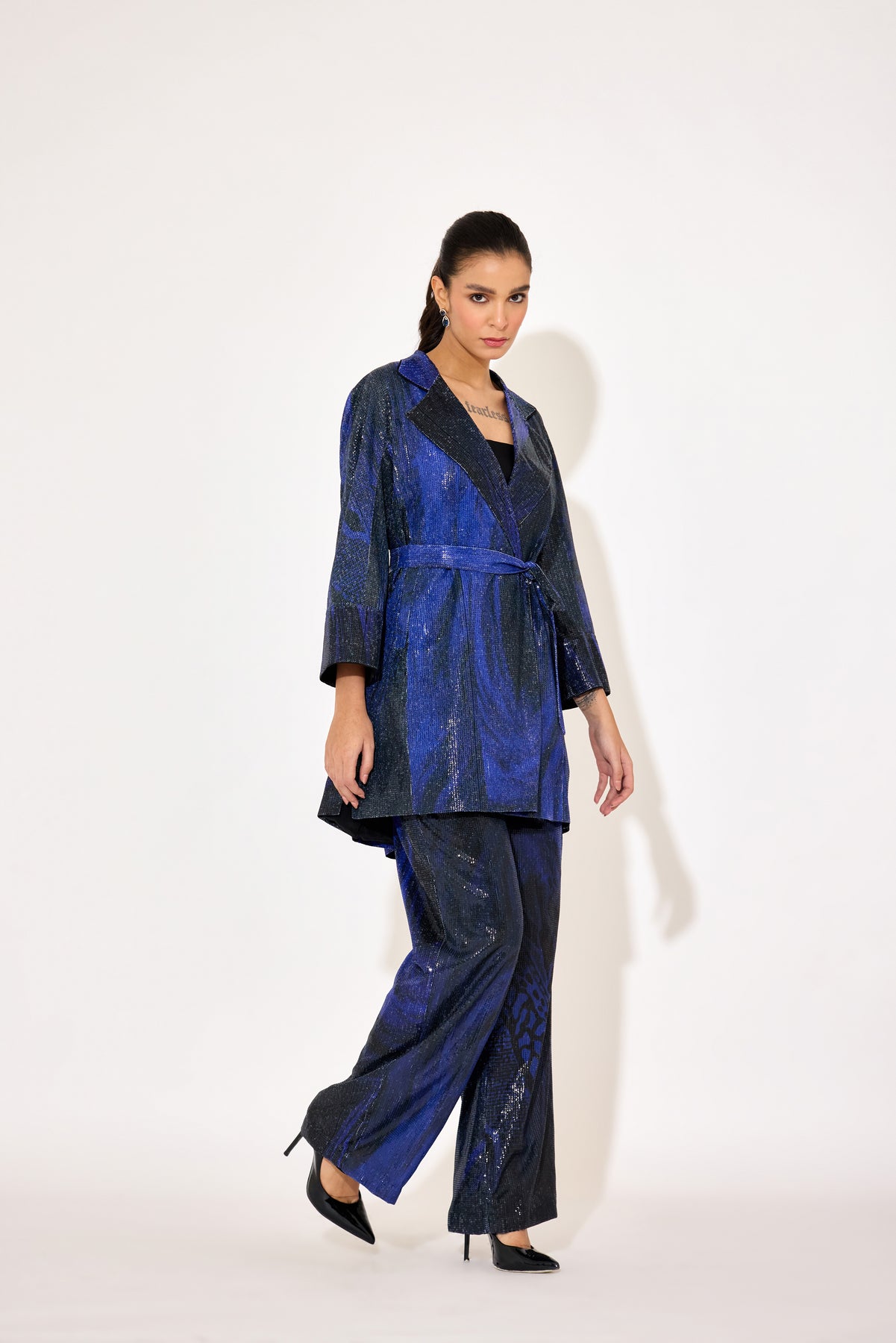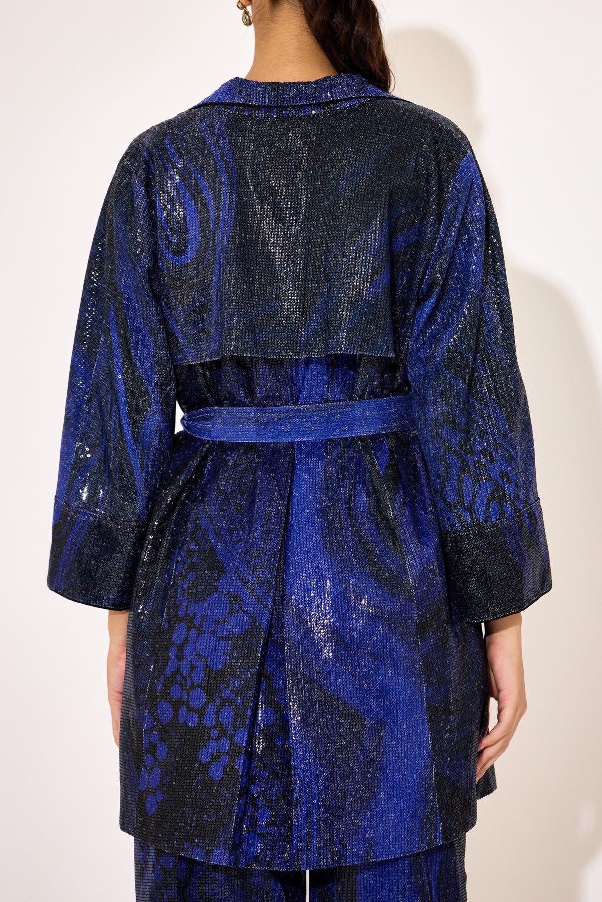 Elevate your outerwear collection with this Black Sequin Trench Coat featuring a striking abstract print on luxurious sequin fabric. Designed with an expert touch, its front tie detail allows for a customizable fit, blending sophistication with contemporary edge. Perfect for making a bold statement while enjoying refined comfort and style