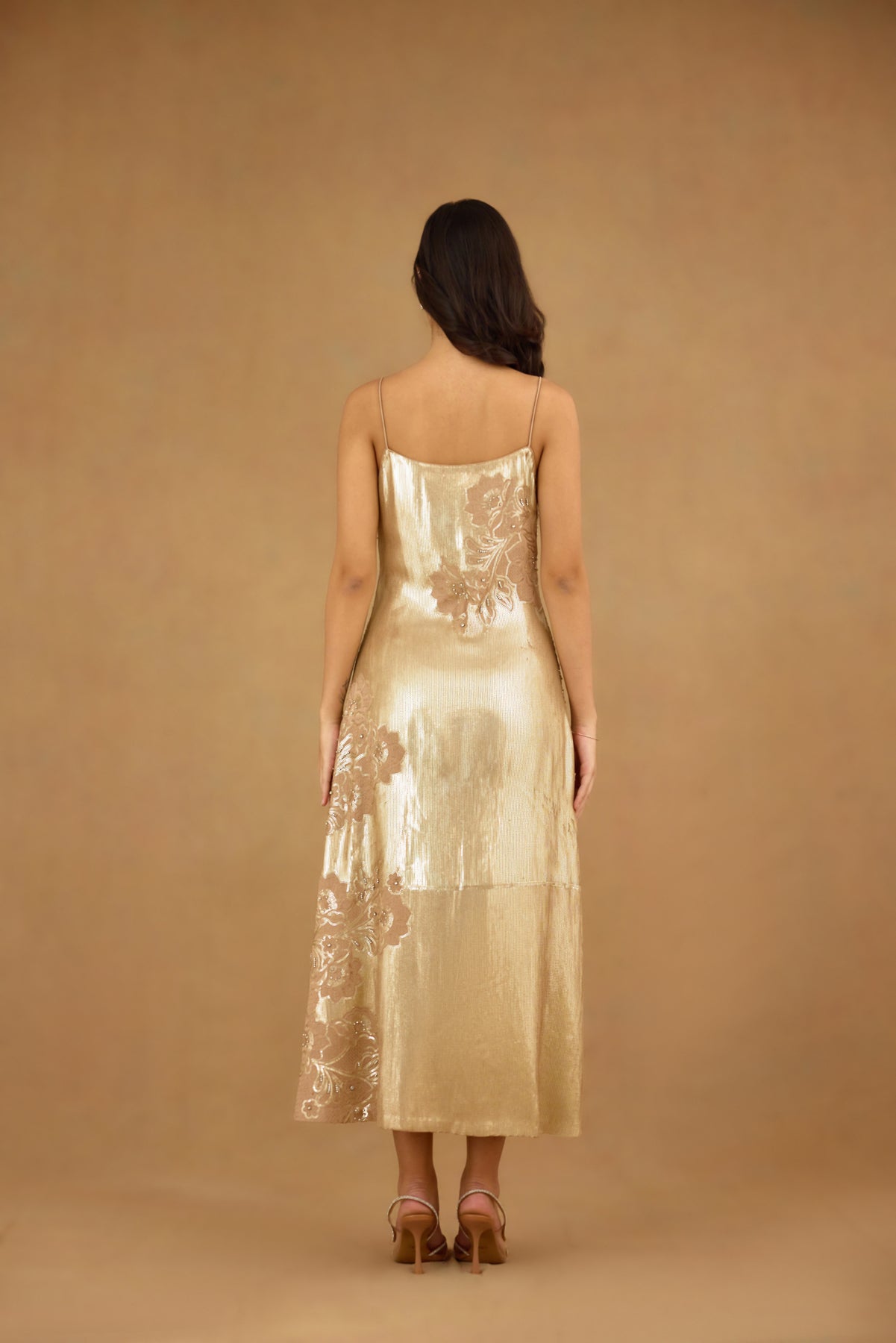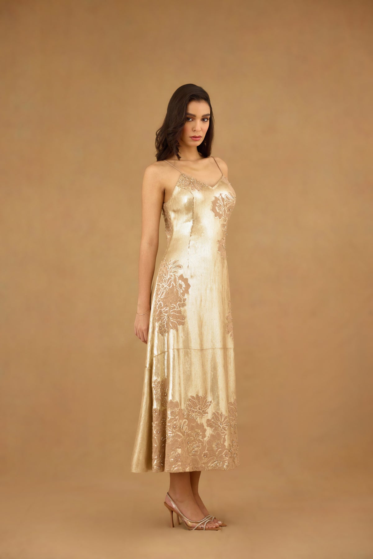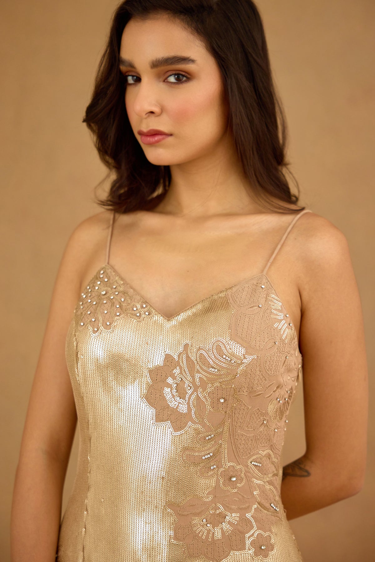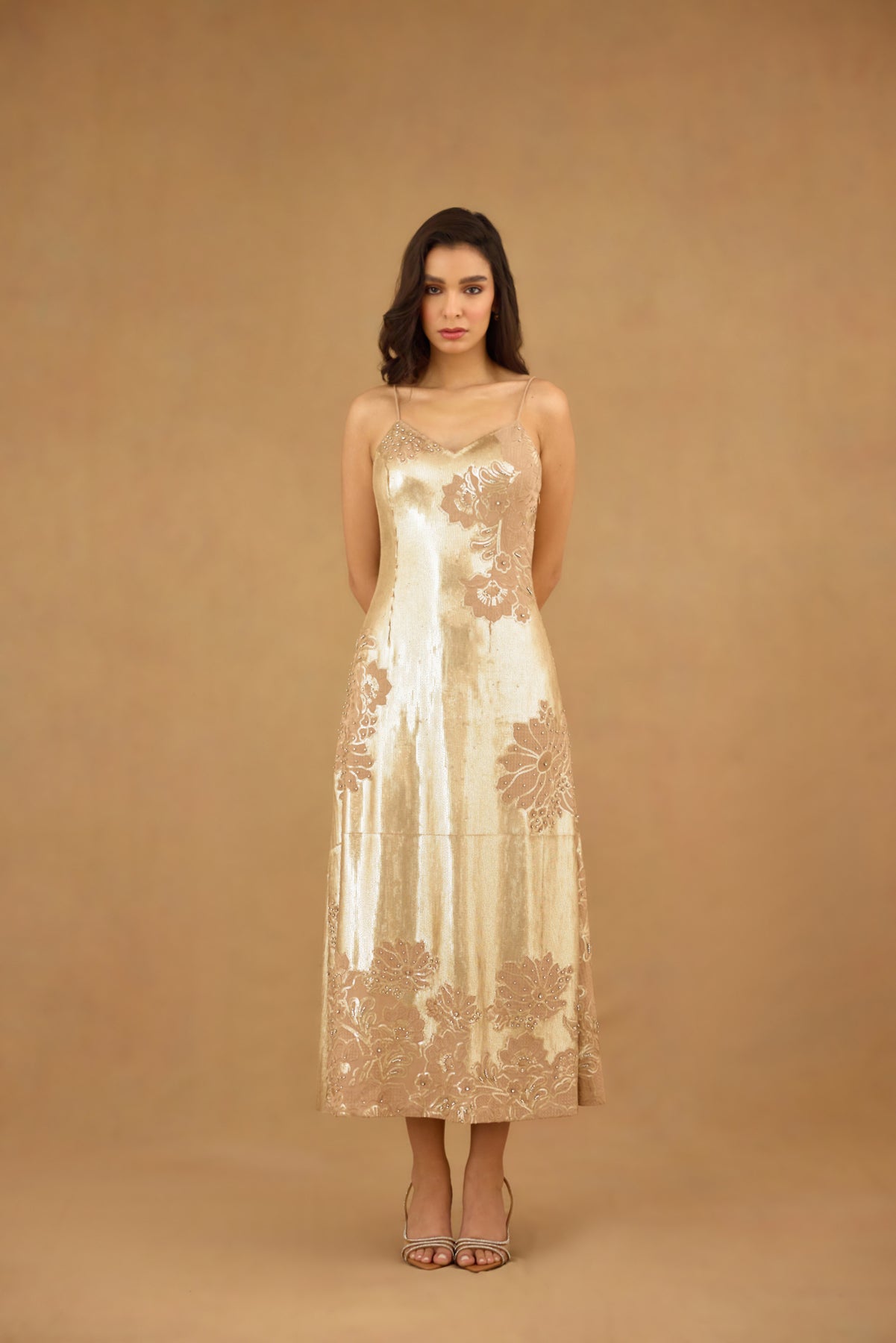 This golden sequin embroidered maxi dress features a sophisticated spaghetti strap design enhanced with intricate floral embroidery and delicate hand embellishments. Crafted for women seeking refined elegance, it offers a graceful silhouette that effortlessly captures light for a radiant look. Ideal for formal occasions, this dress blends artistry with timeless glamour.