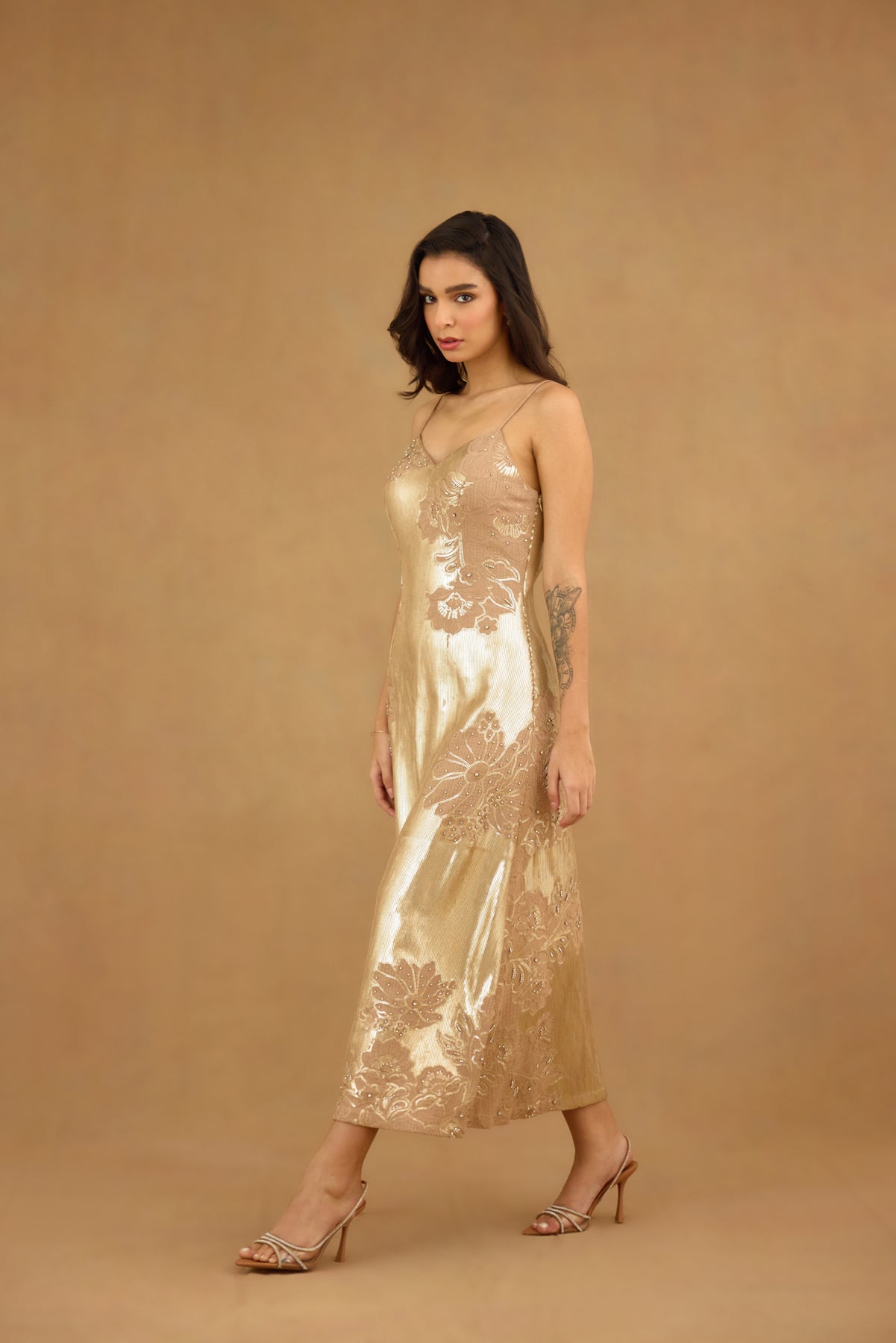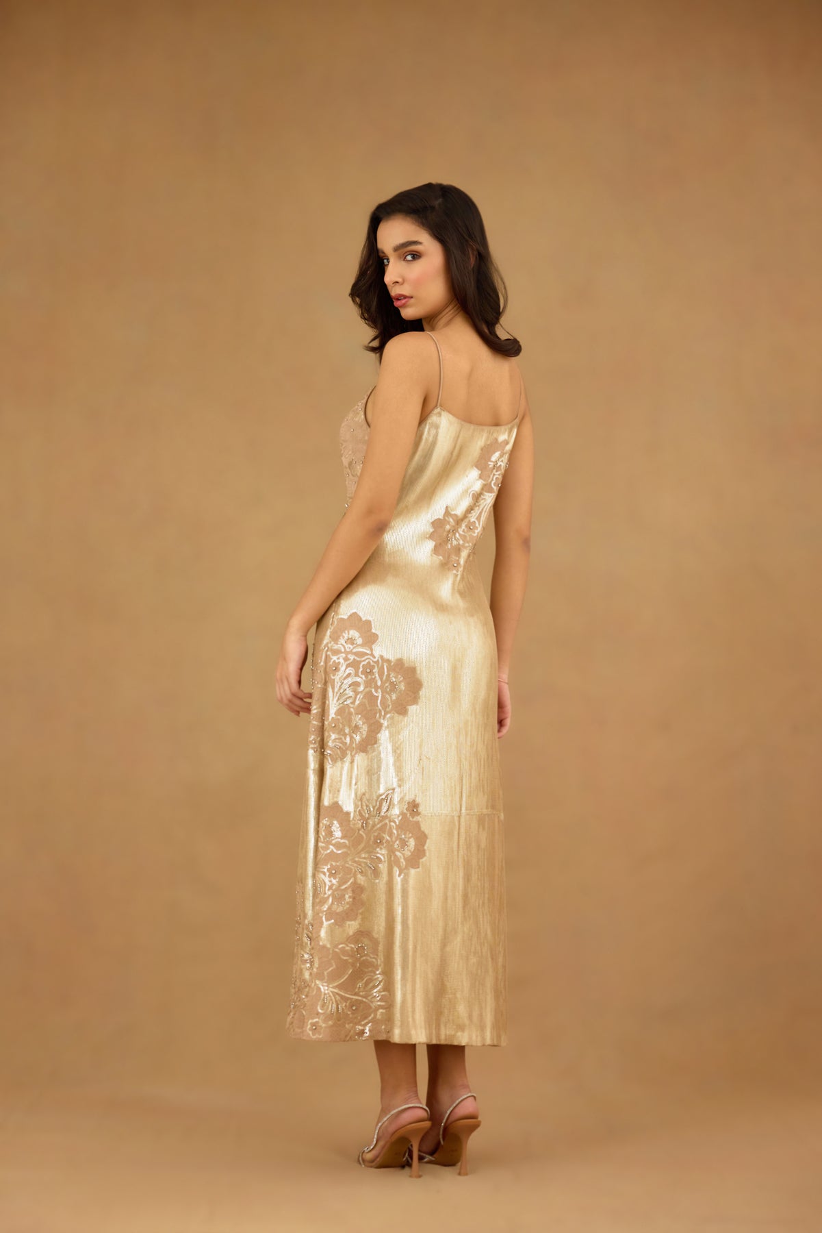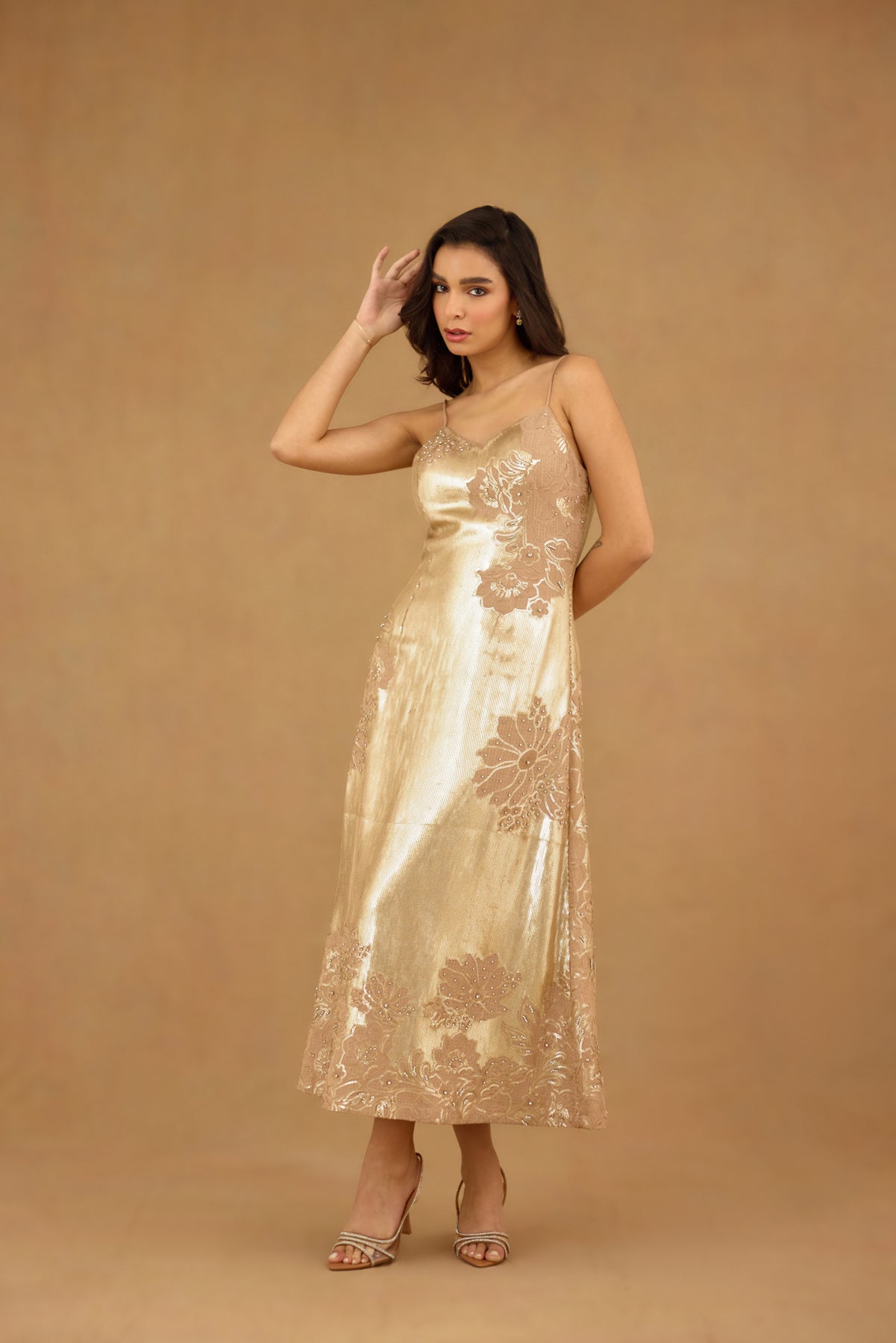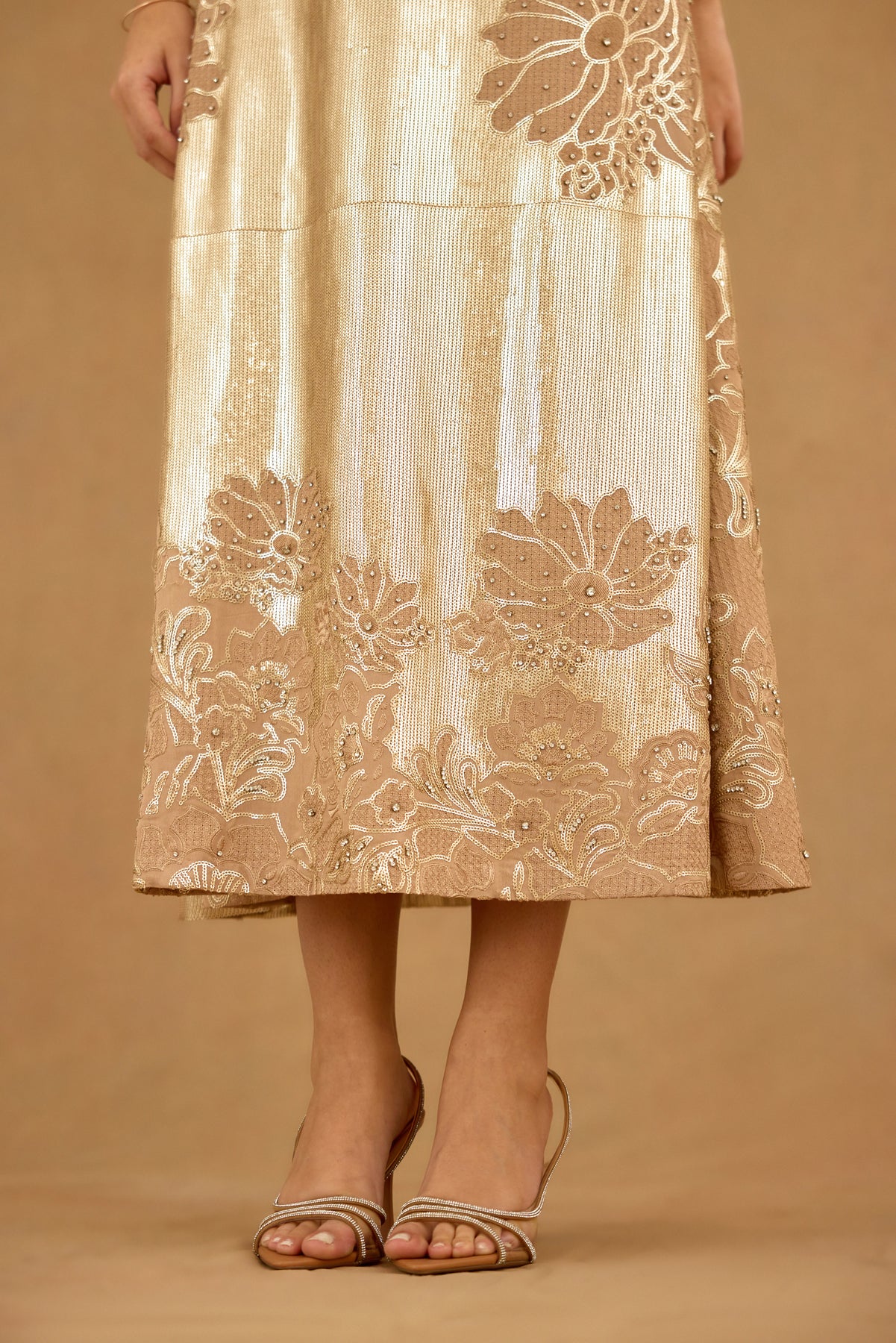 This golden sequin embroidered maxi dress features a sophisticated spaghetti strap design enhanced with intricate floral embroidery and delicate hand embellishments. Crafted for women seeking refined elegance, it offers a graceful silhouette that effortlessly captures light for a radiant look. Ideal for formal occasions, this dress blends artistry with timeless glamour.