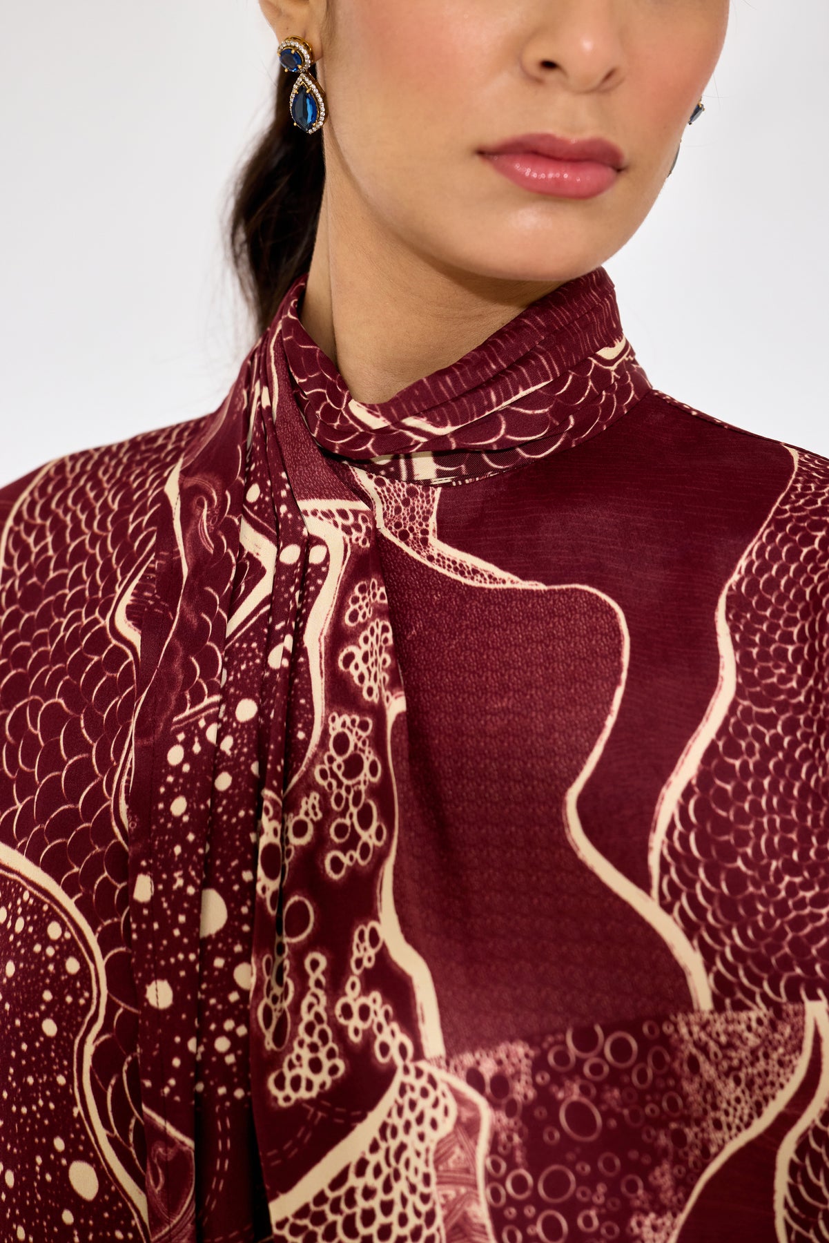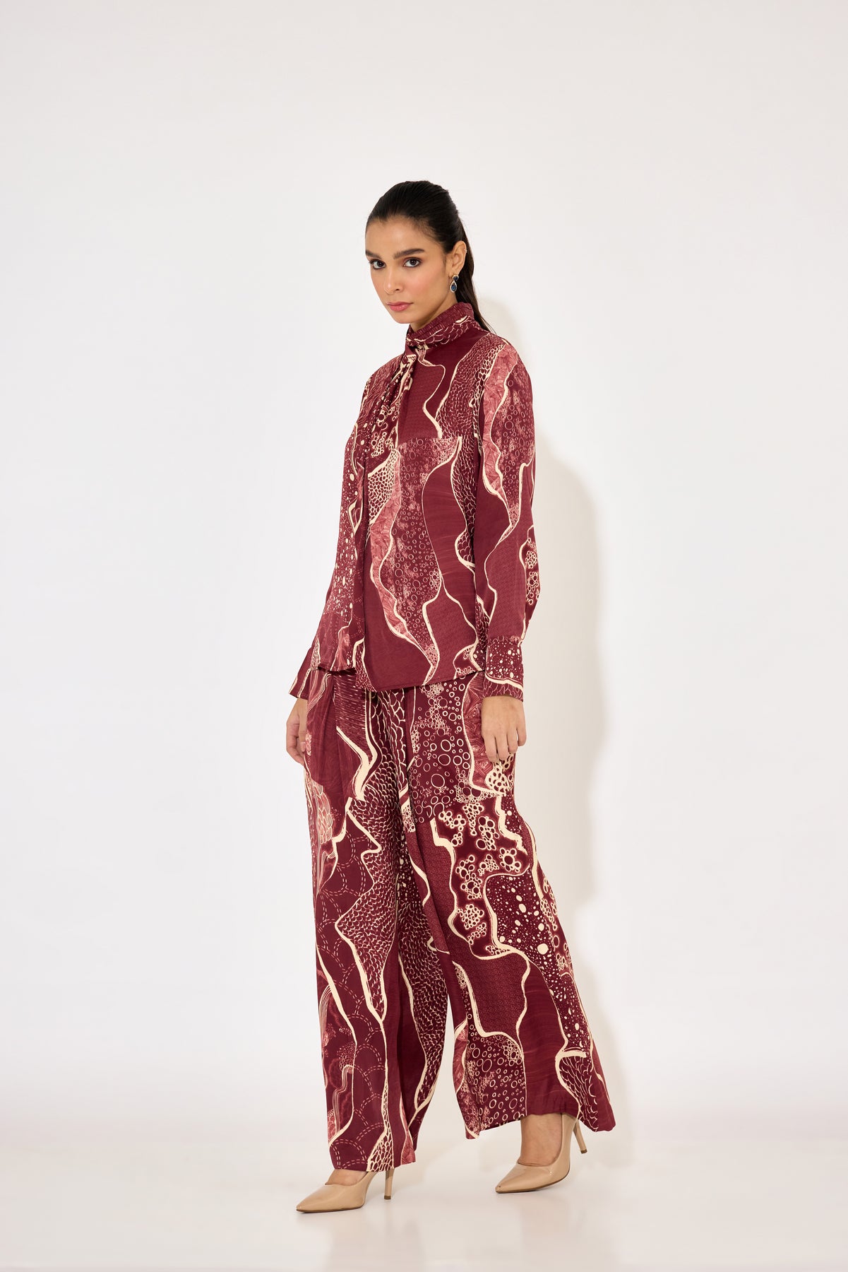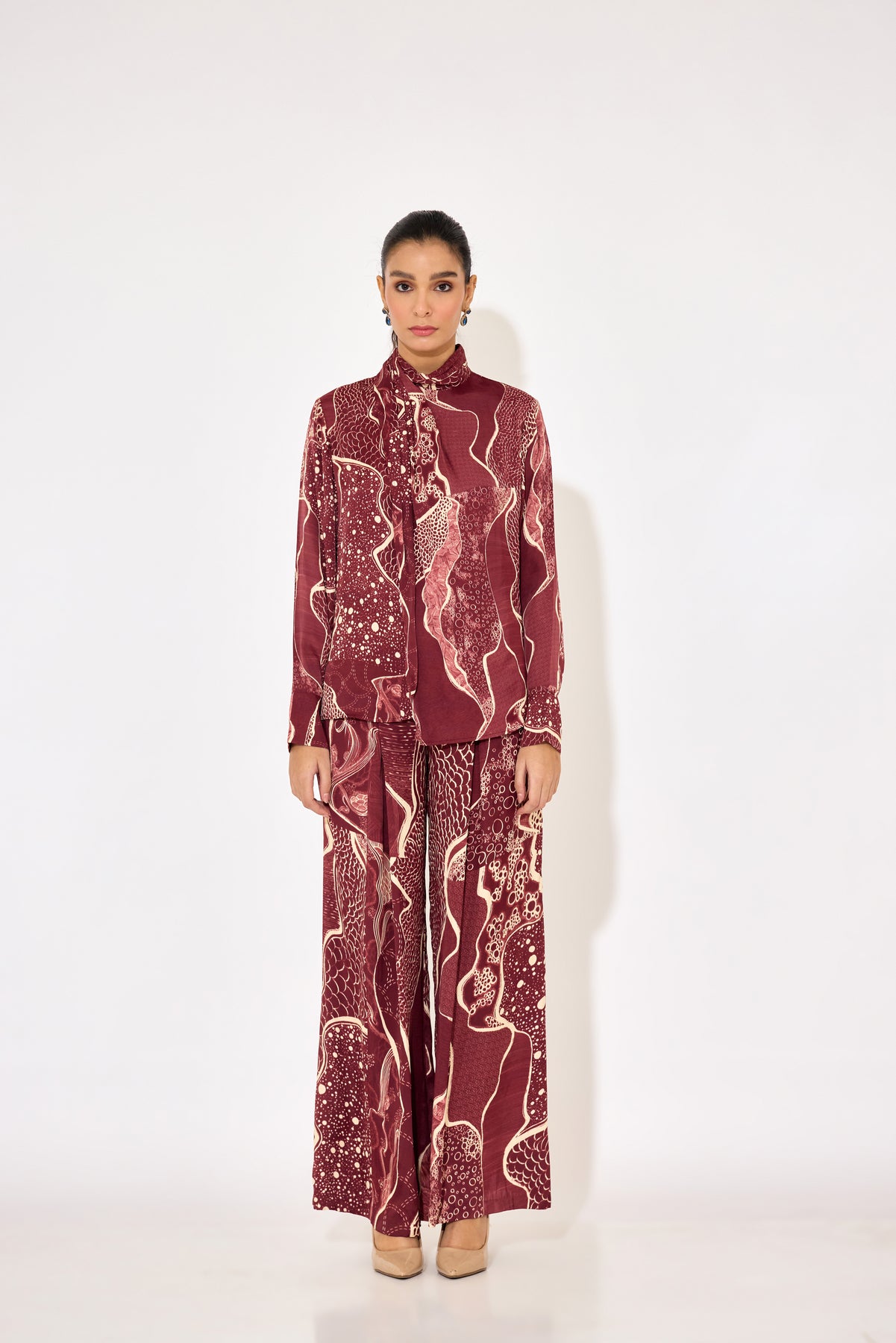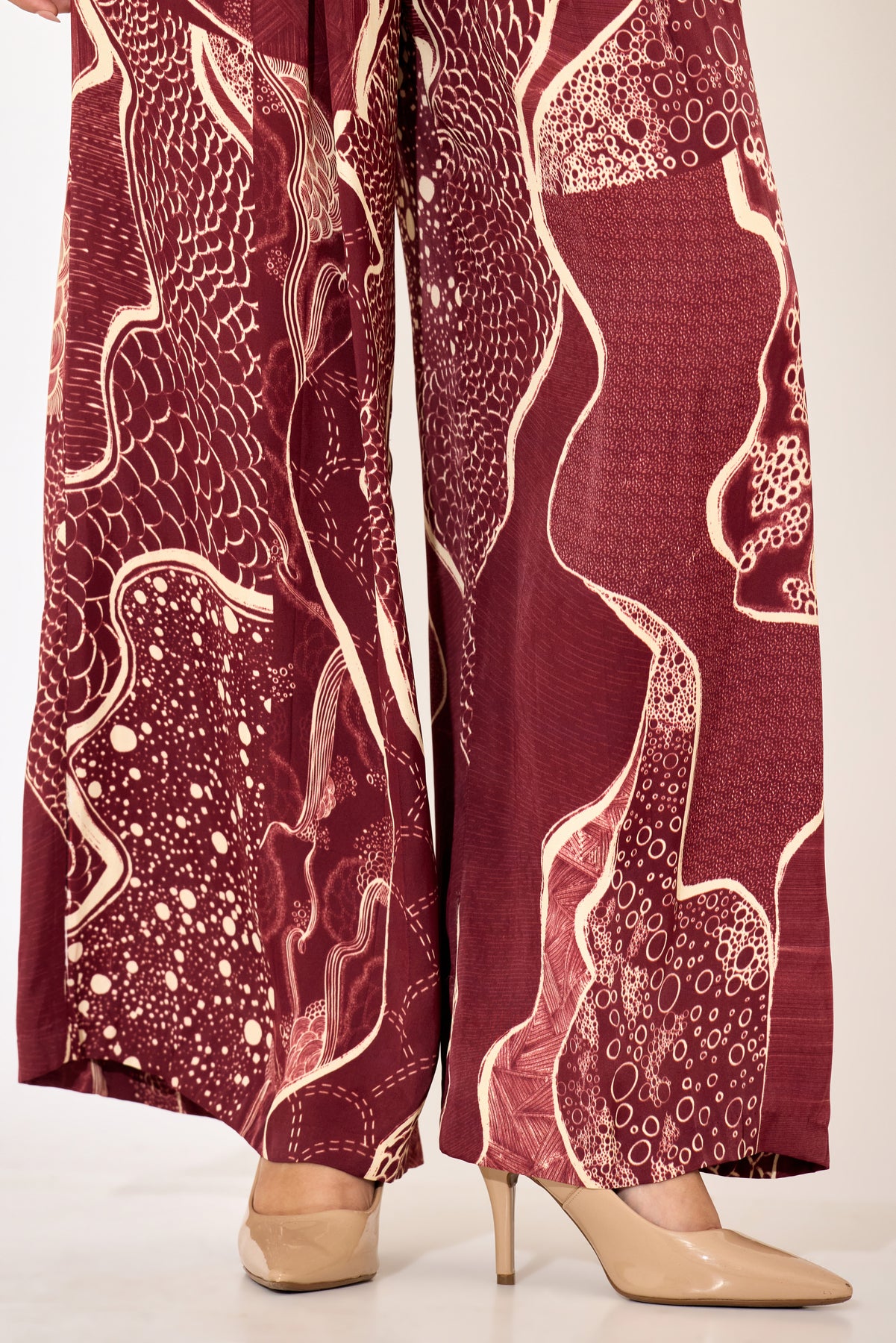 This maroon co-ord set features a stylish abstract print, combining an inverted pleat pant with a turtle neck, draped full sleeve top. Designed for both comfort and sophistication, the flow of the pleated pants complements the elegant drape of the top, creating a balanced silhouette. Ideal for women seeking a refined yet contemporary look, this set offers versatility for various occasions.