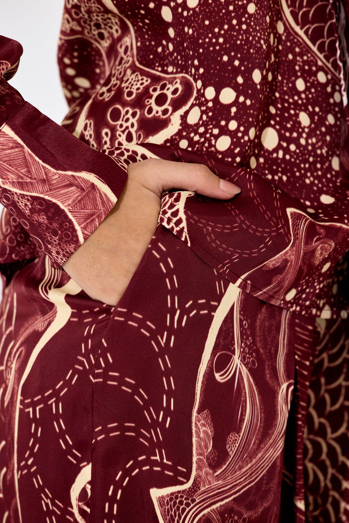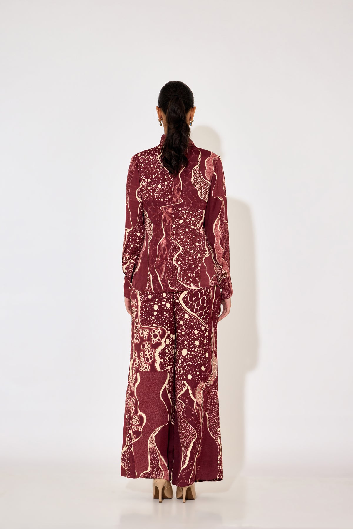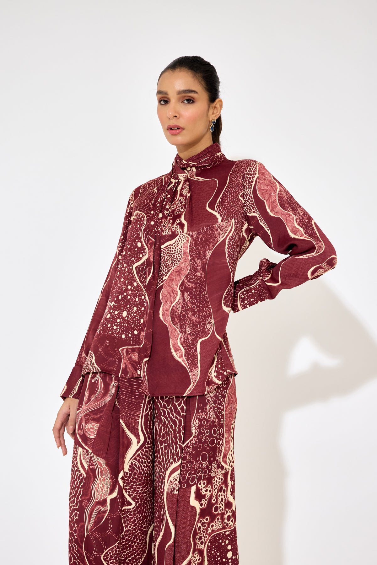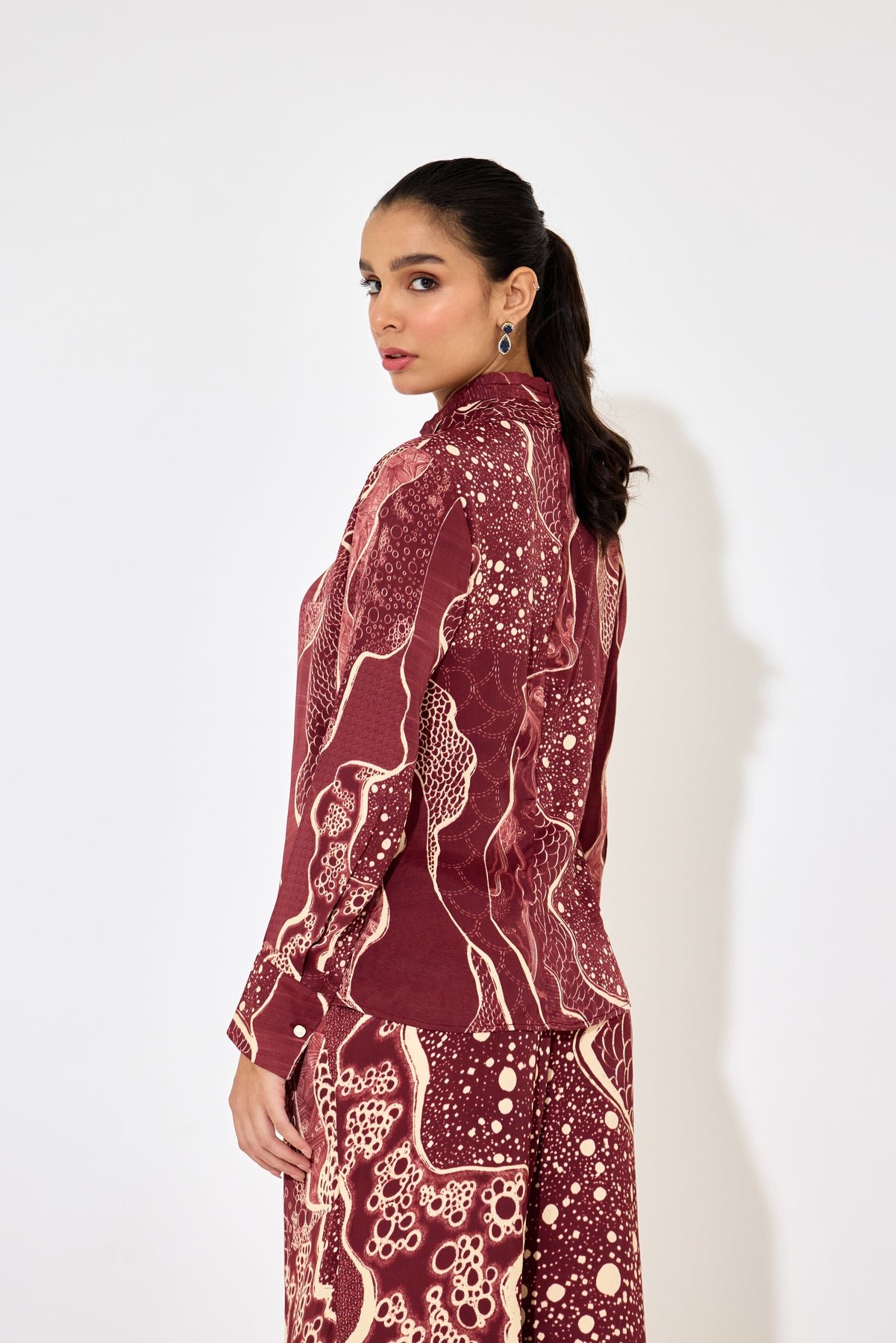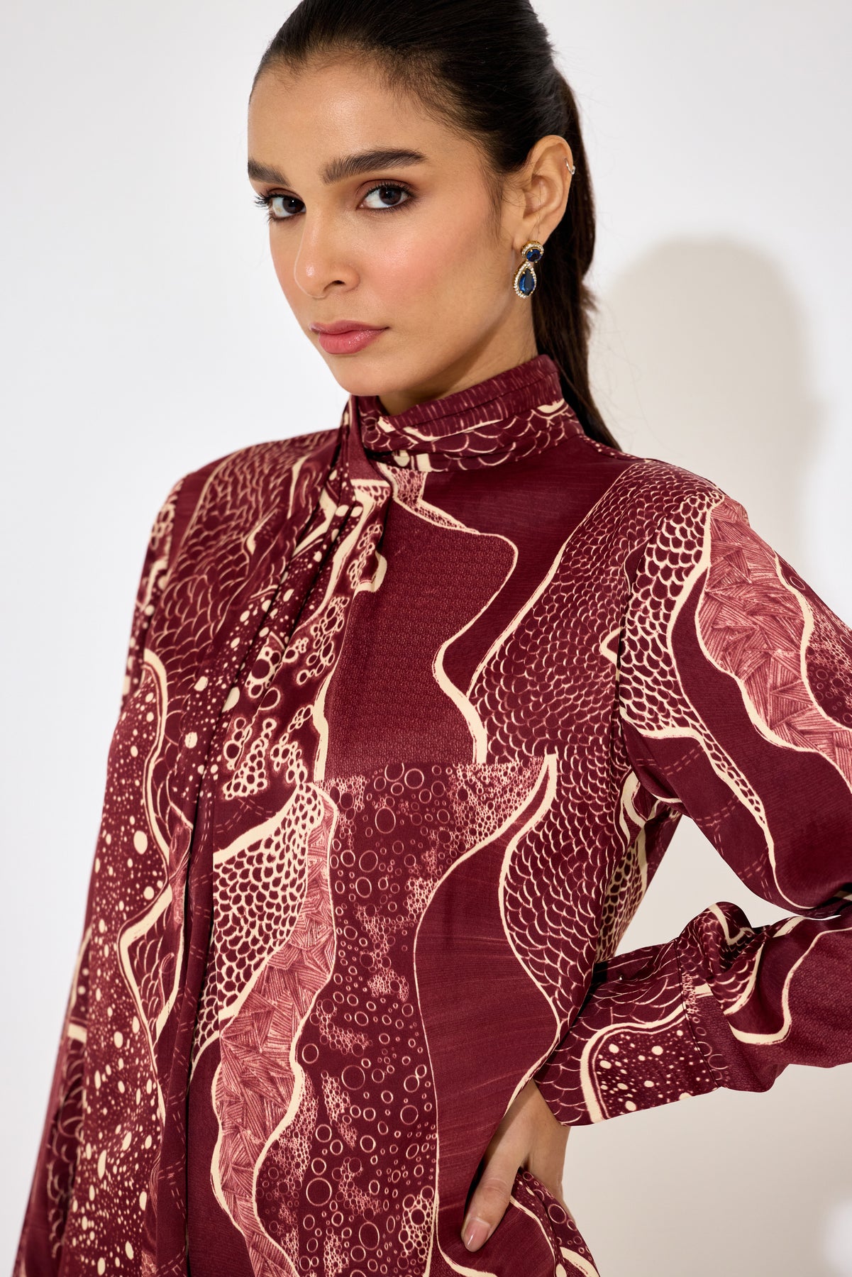 This maroon co-ord set features a stylish abstract print, combining an inverted pleat pant with a turtle neck, draped full sleeve top. Designed for both comfort and sophistication, the flow of the pleated pants complements the elegant drape of the top, creating a balanced silhouette. Ideal for women seeking a refined yet contemporary look, this set offers versatility for various occasions.