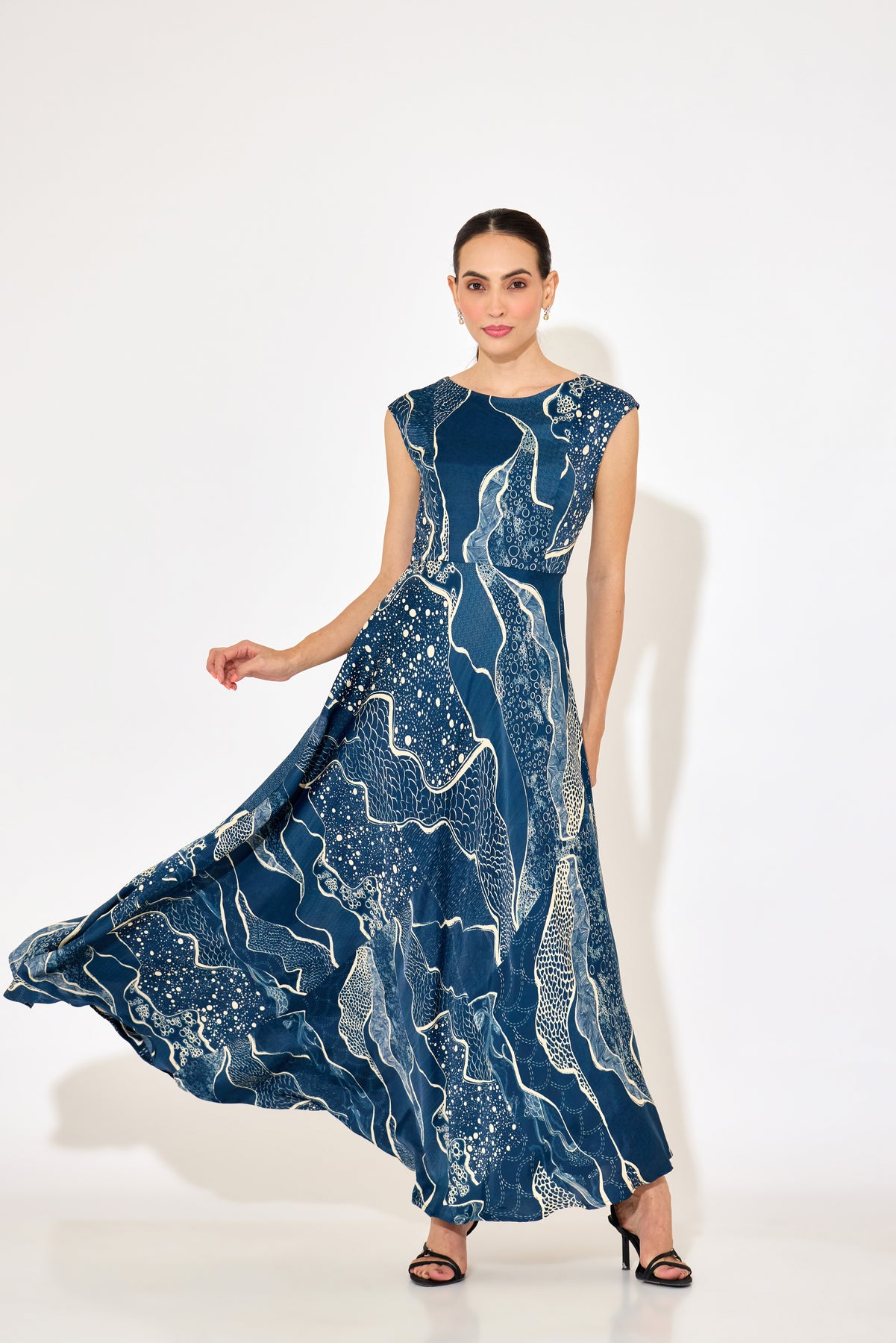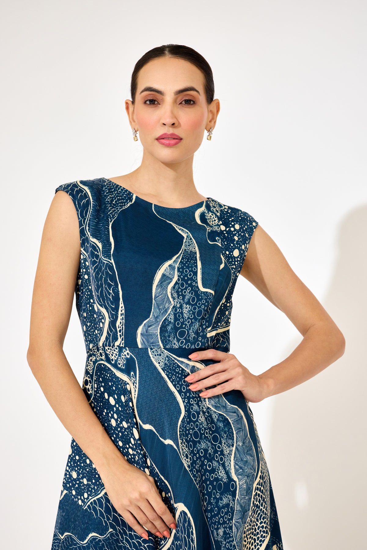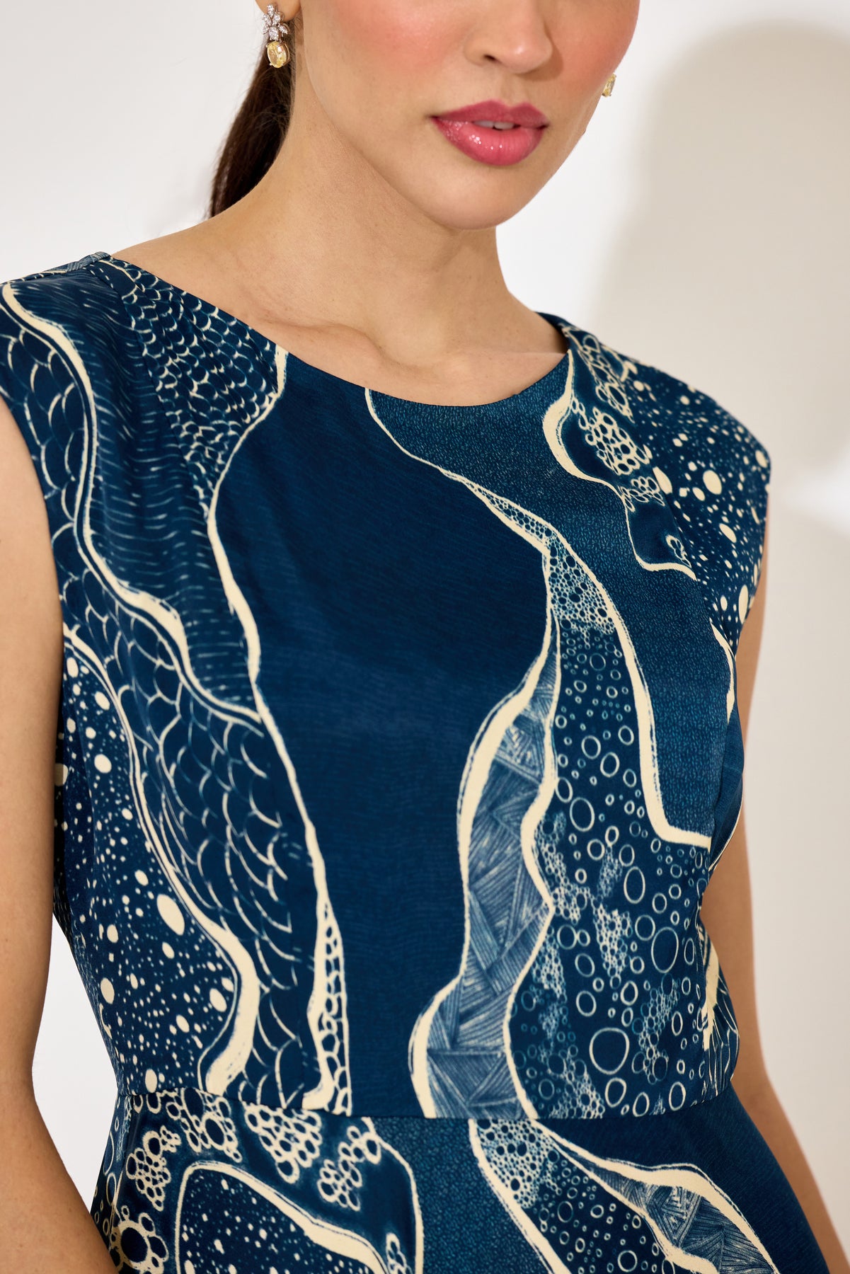 This navy blue dress features an abstract print that adds a sophisticated touch to your wardrobe. Designed with a closed neck and sleeveless cut, it offers a flattering fit while ensuring comfort. The flare silhouette enhances movement and creates an elegant shape, making it an ideal choice for both formal and casual occasions. Crafted for women who appreciate style and versatility, this dress combines timeless design with contemporary appeal.