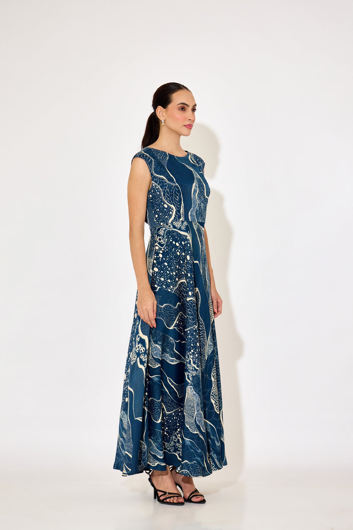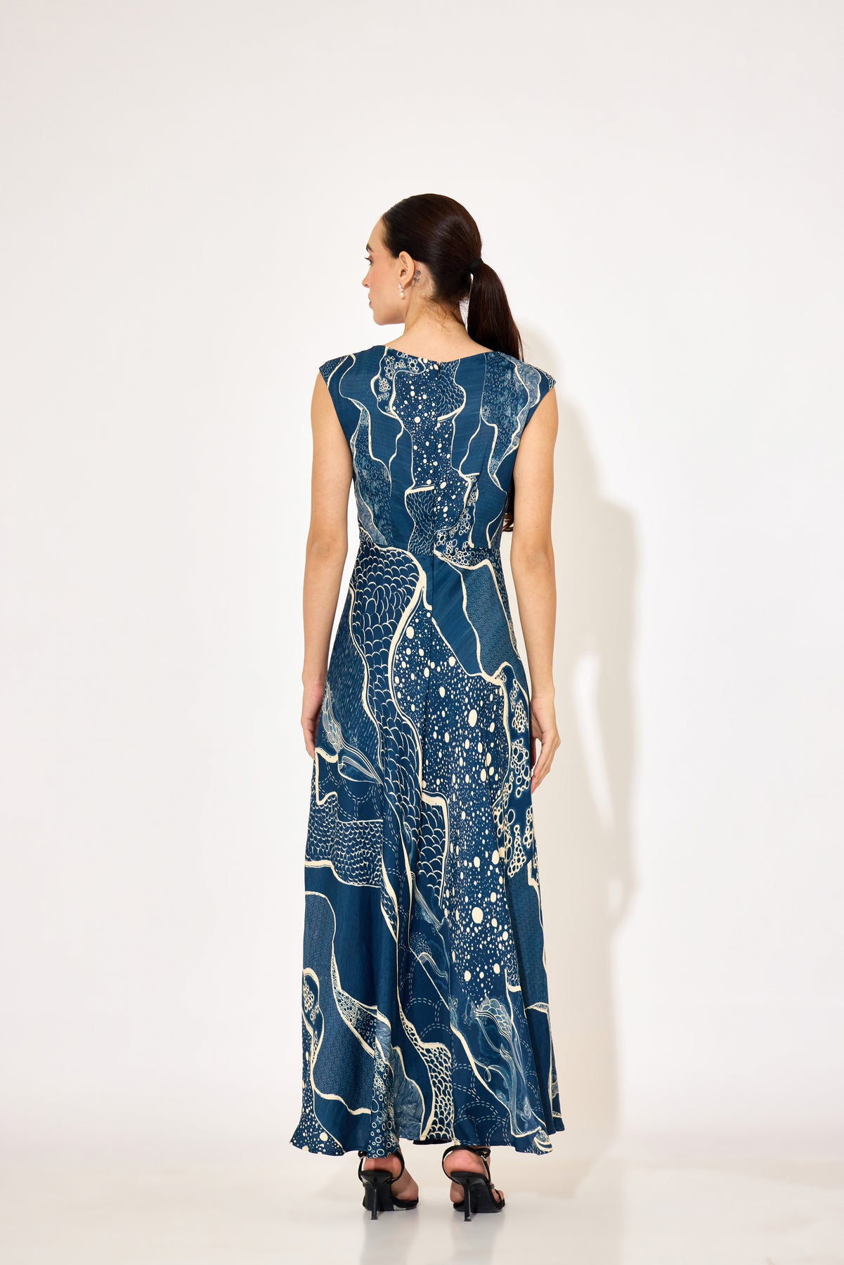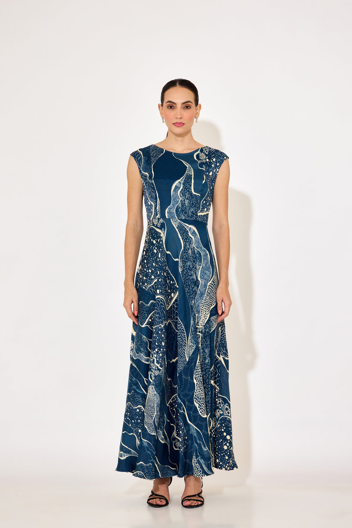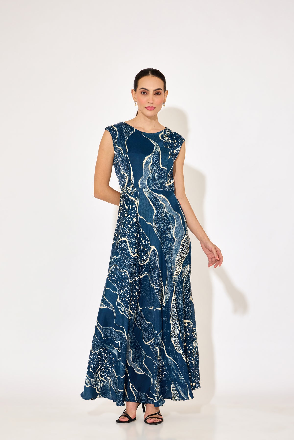 This navy blue dress features an abstract print that adds a sophisticated touch to your wardrobe. Designed with a closed neck and sleeveless cut, it offers a flattering fit while ensuring comfort. The flare silhouette enhances movement and creates an elegant shape, making it an ideal choice for both formal and casual occasions. Crafted for women who appreciate style and versatility, this dress combines timeless design with contemporary appeal.