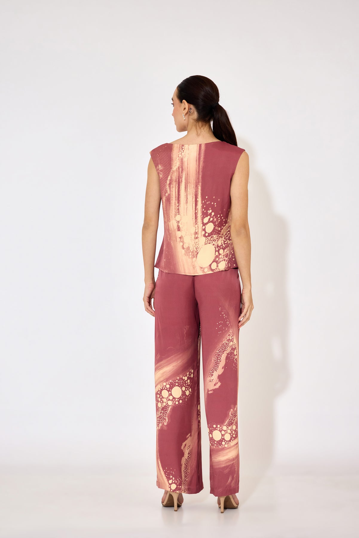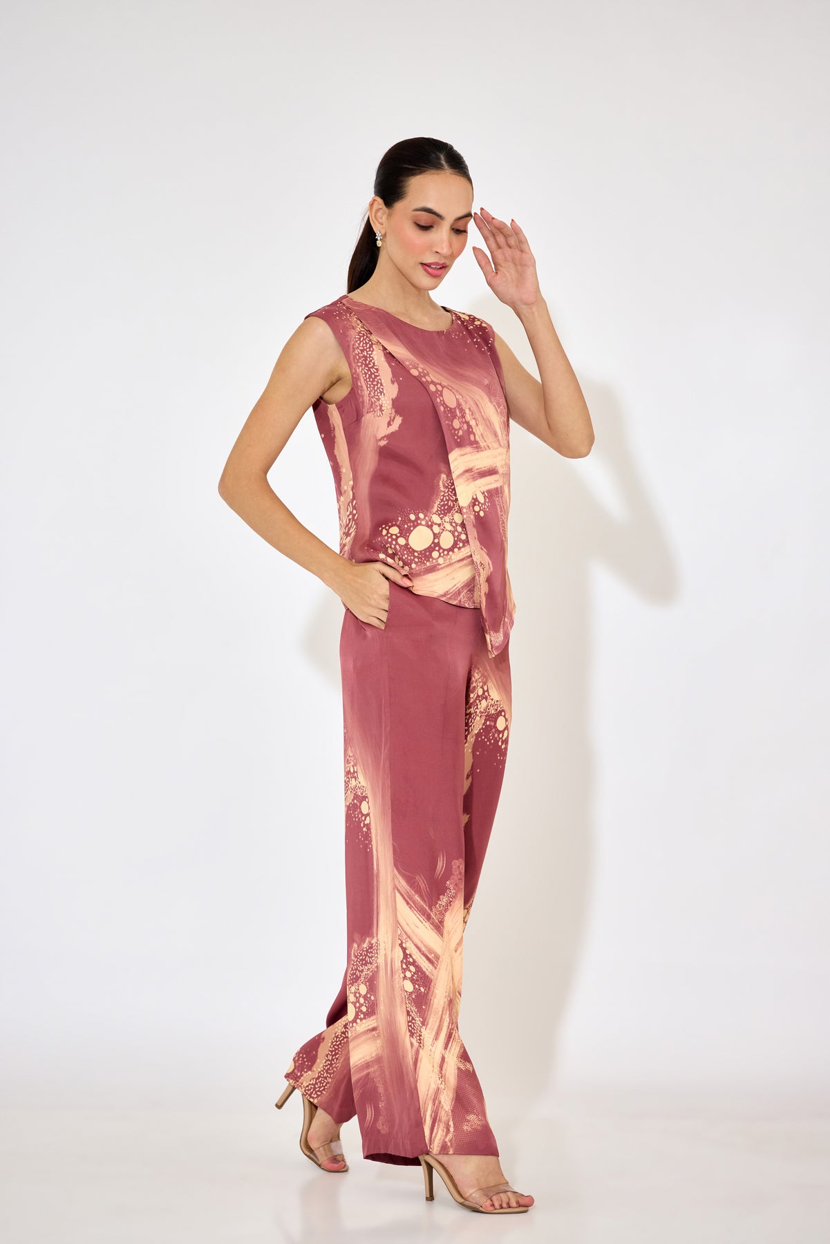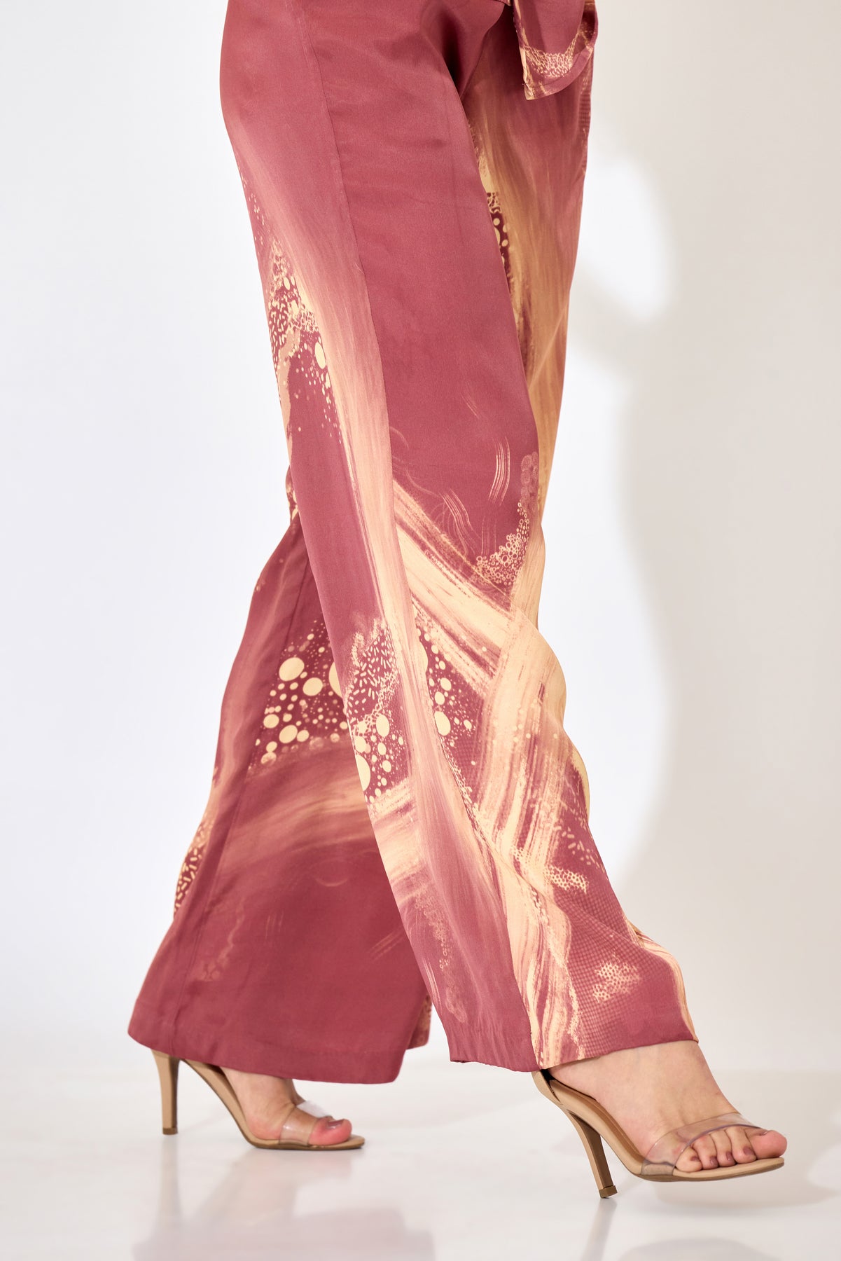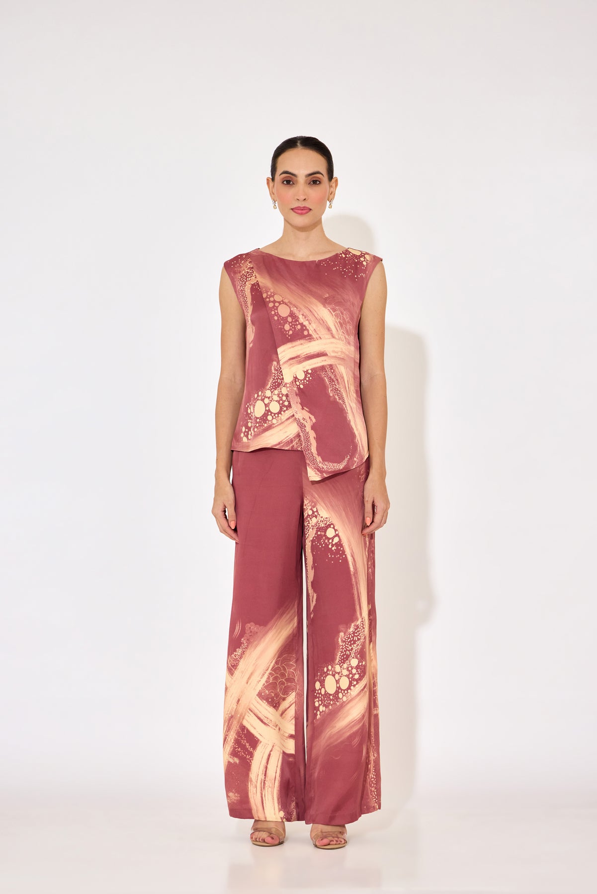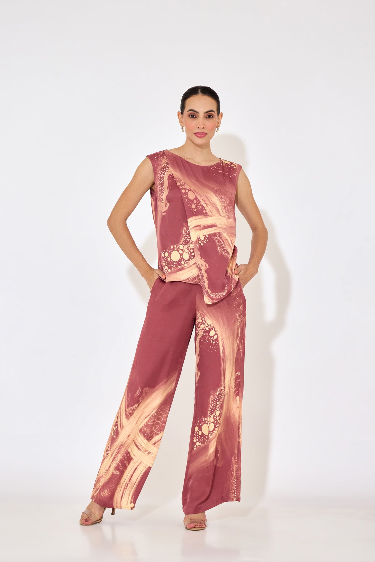 Elevate your wardrobe with this expertly designed printed co-ord set in a rich ruby wine hue. Featuring an abstract print, the asymmetrical top adds modern sophistication while the straight-fit pants provide a sleek, flattering silhouette. Perfect for stylish, confident women seeking a versatile outfit that balances contemporary design with comfort.