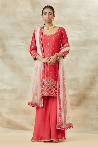 Golden seed bead lehenga with pattern artwork and red dabka insertions in between the pattern