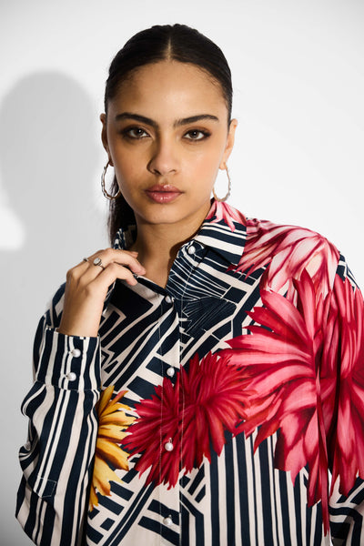 Oversized Floral & Blue Stripes High Low Shirt