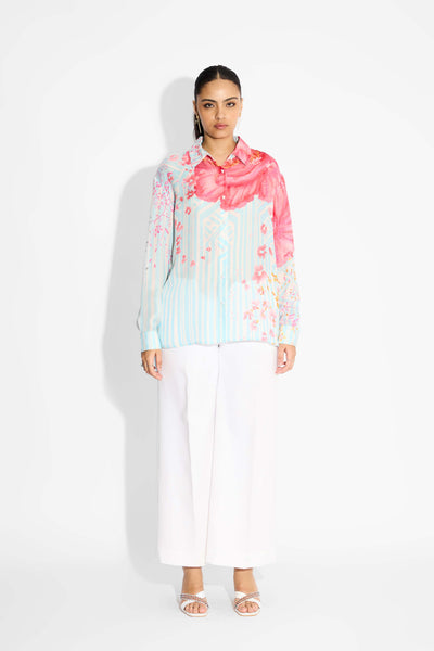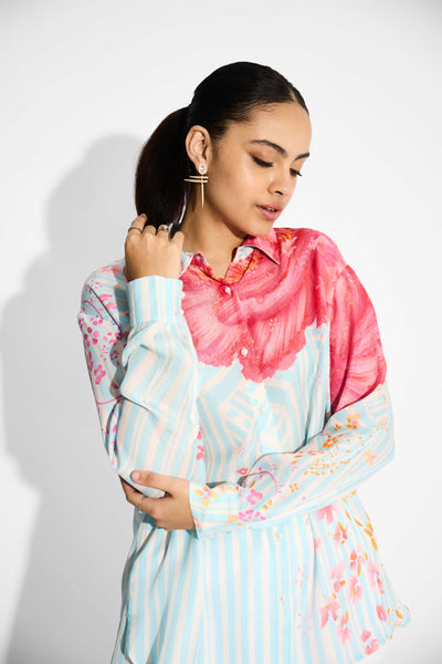 Oversized Floral & Sky Blue Stripe High Low Shirt