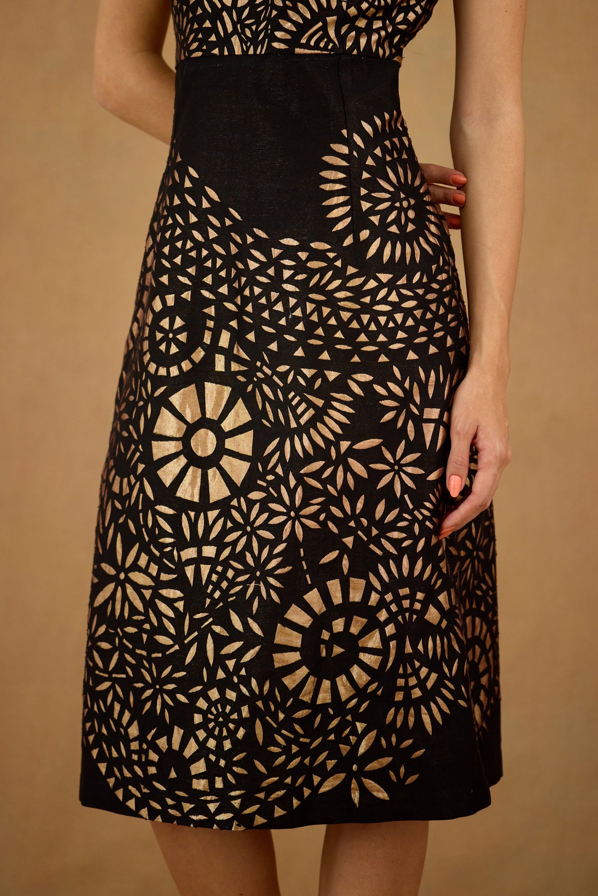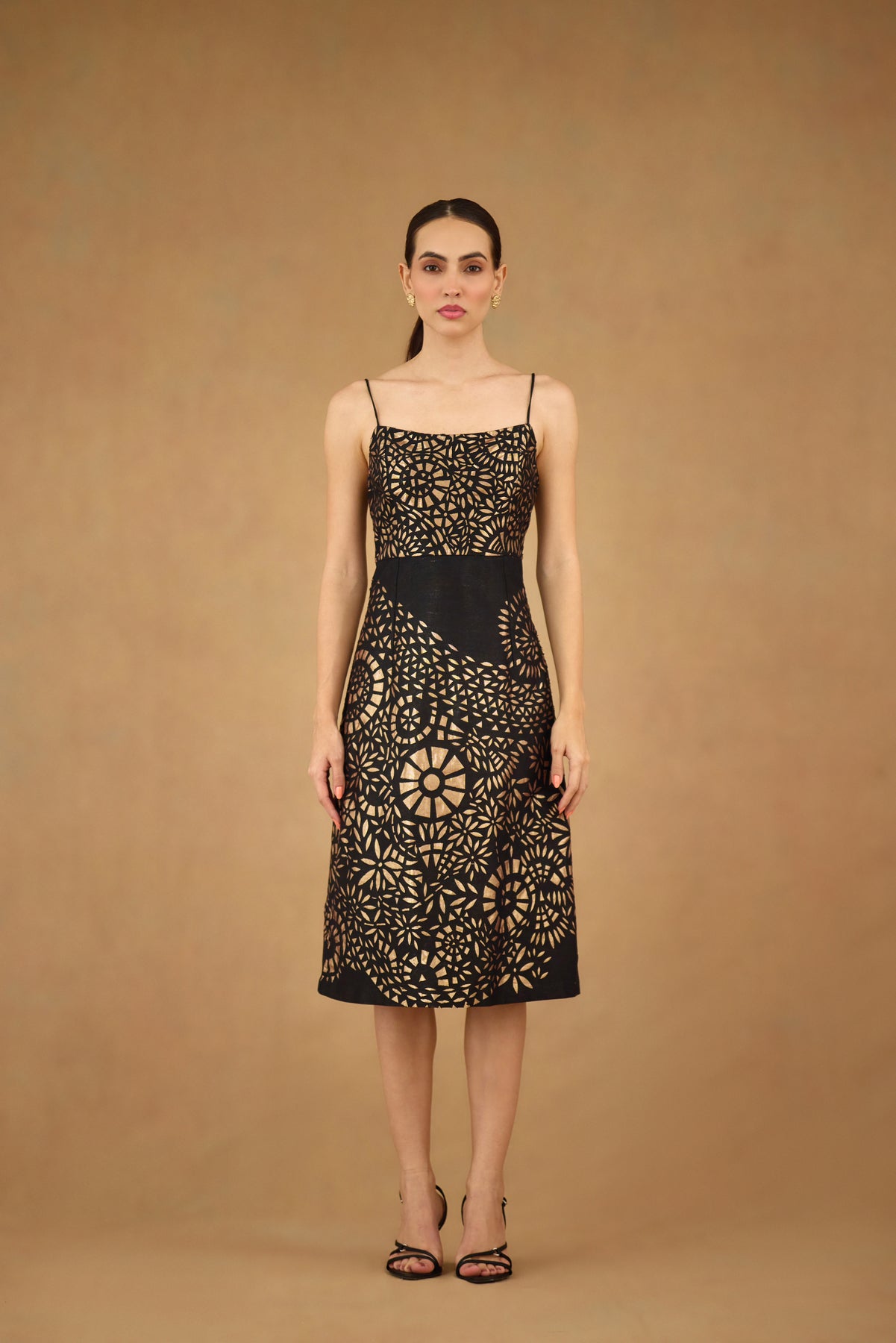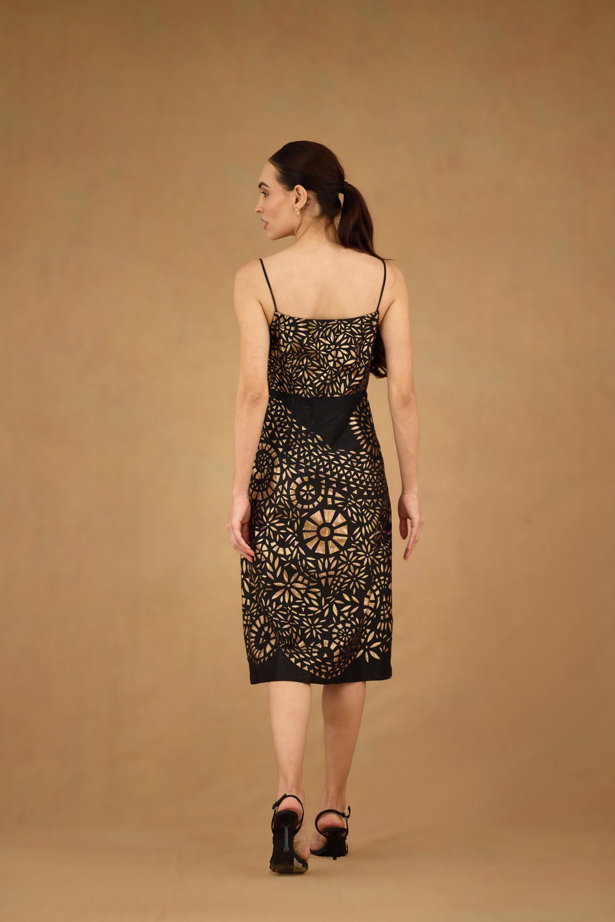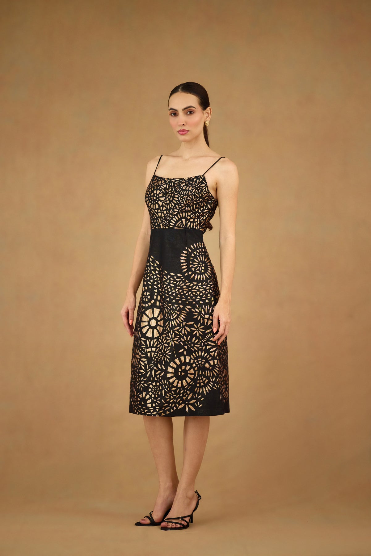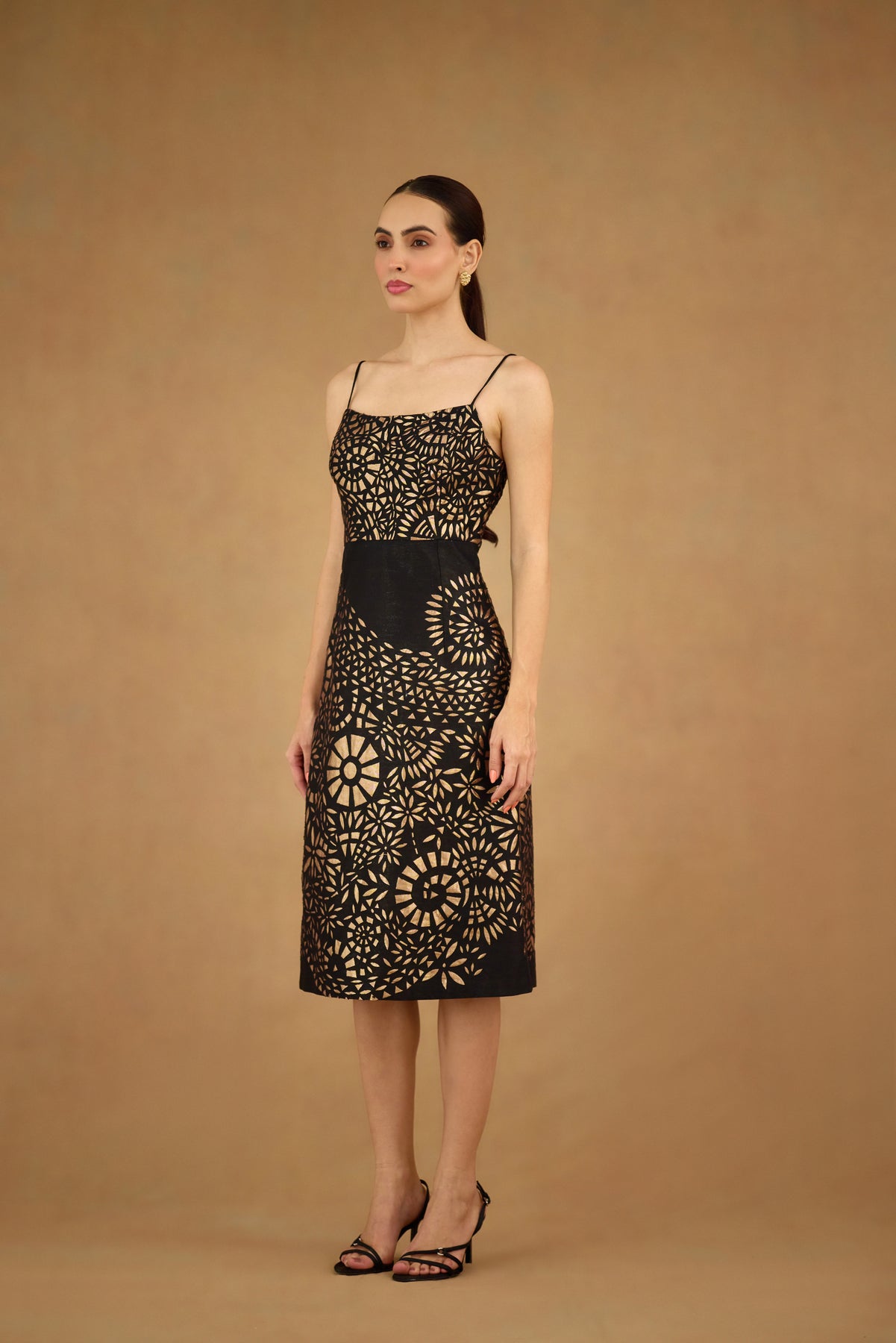 This black and gold laser-cut midi dress for women features delicate spaghetti straps and a tailored fit that flatters the silhouette. The detailed laser-cut pattern showcases intricate craftsmanship, while the gold accents add a touch of luxury. Perfect for formal events or elegant evenings, this dress combines contemporary design with timeless sophistication.