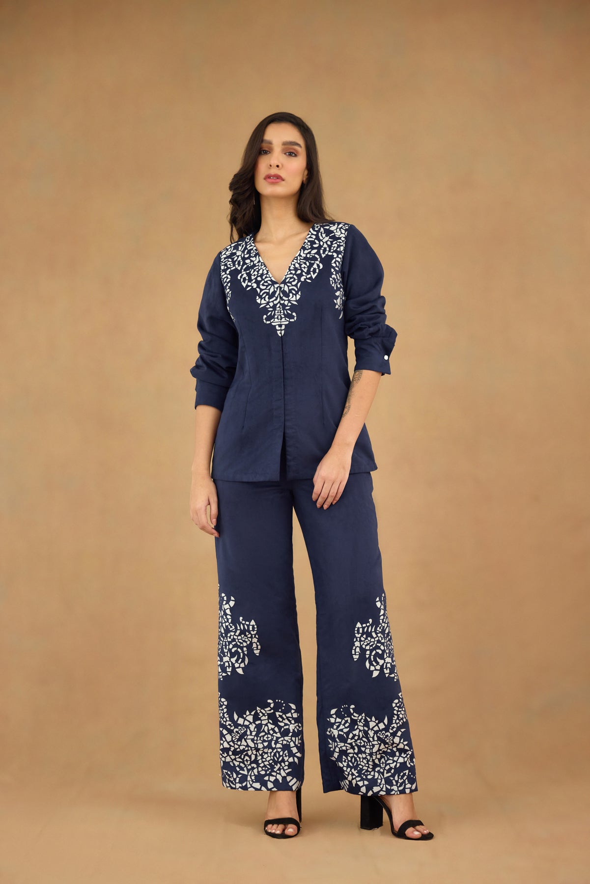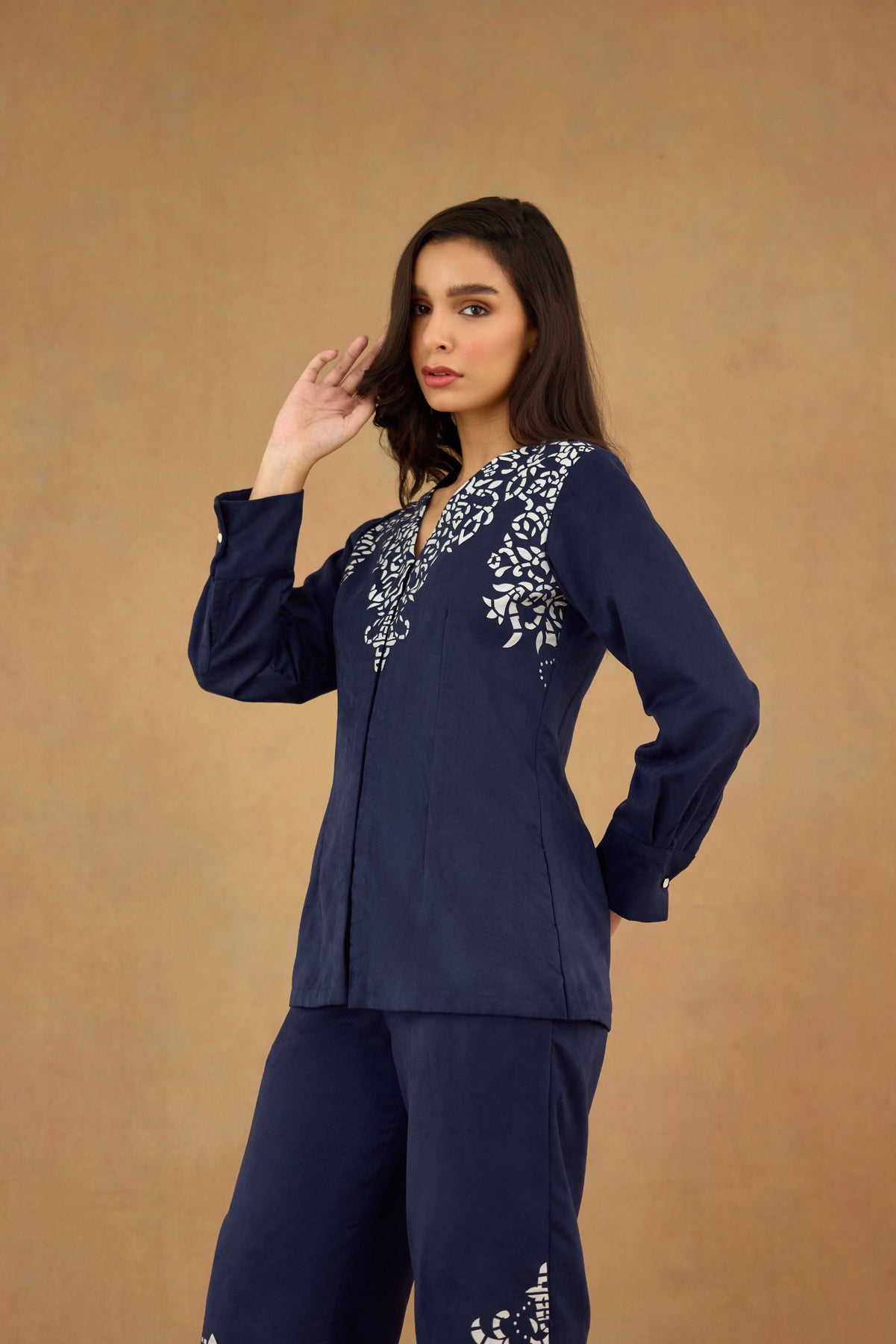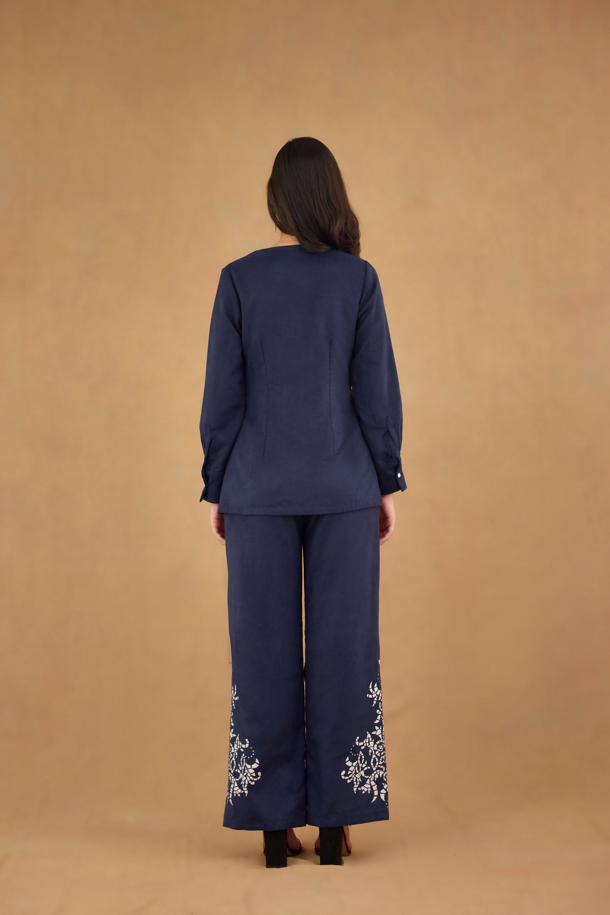 This navy blue suede co-ord set features a laser-cut design that adds subtle texture and sophistication. The front-open V-neck top with full sleeves offers a flattering silhouette, while the straight-fit pants ensure comfort and a streamlined look. Perfect for polished, contemporary styling, this set combines refined craftsmanship with versatile wearability.