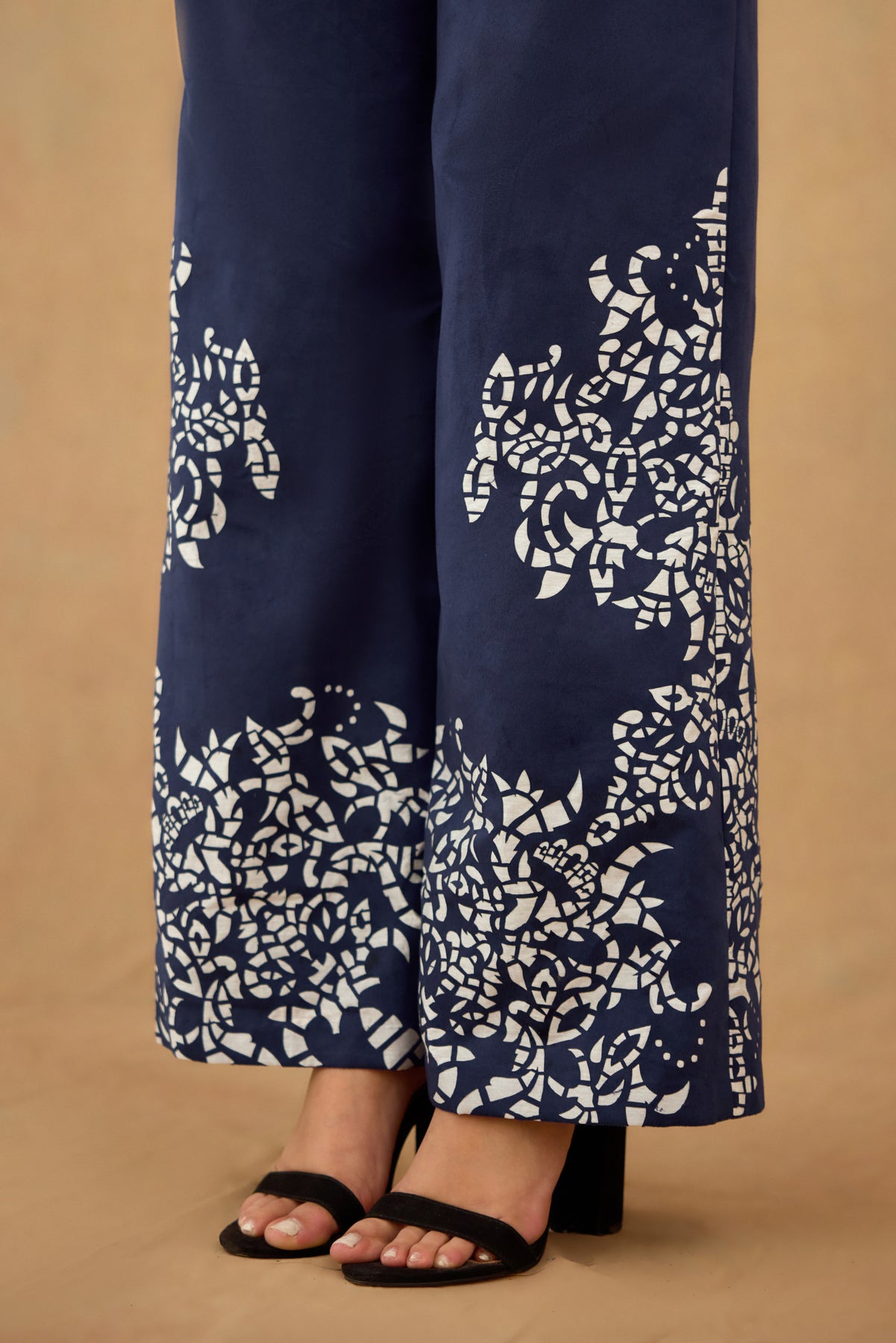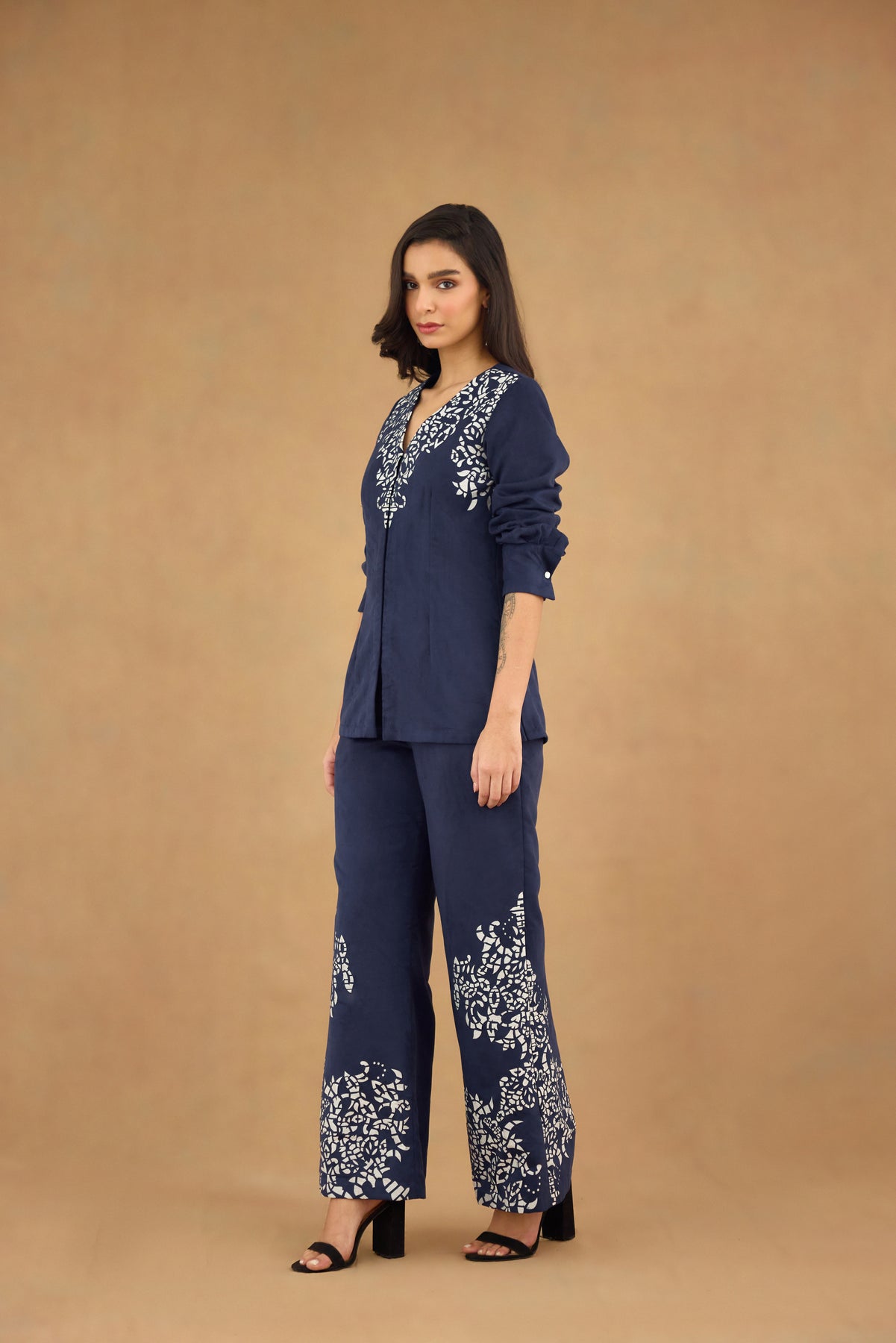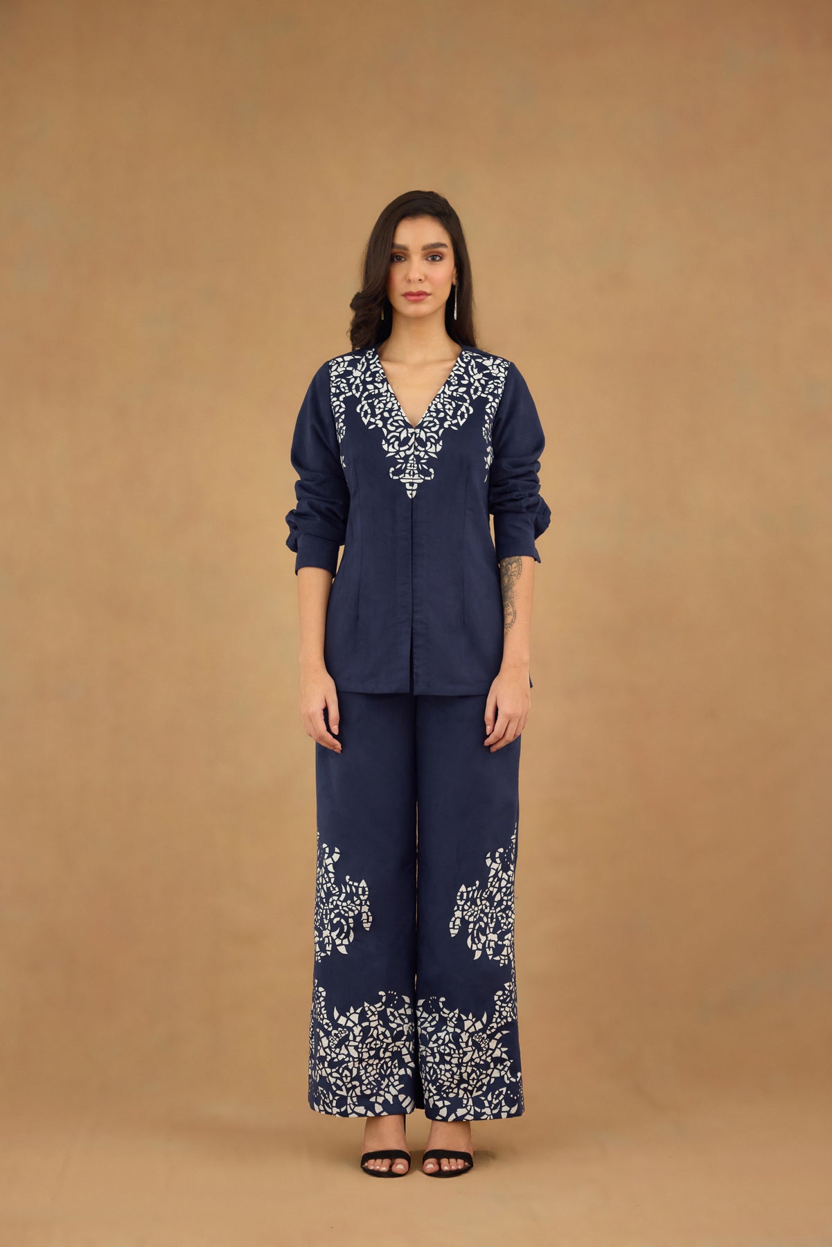 This navy blue suede co-ord set features a laser-cut design that adds subtle texture and sophistication. The front-open V-neck top with full sleeves offers a flattering silhouette, while the straight-fit pants ensure comfort and a streamlined look. Perfect for polished, contemporary styling, this set combines refined craftsmanship with versatile wearability.
