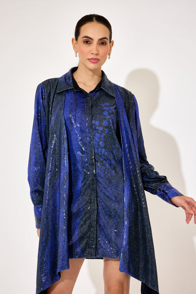 This black sequin dress features an elegant abstract print complemented by a sophisticated front drape and a practical button-up opening. Designed for women who appreciate refined style, it offers a striking balance of texture and structure, enhancing your silhouette while ensuring ease of wear. Ideal for evening events, this dress brings subtle glamour with its shimmering sequins and tailored details.