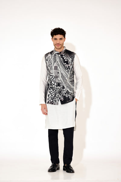 Elevate your formal wardrobe with this black waistcoat featuring a distinctive abstract print. Crafted for a sharp silhouette, it blends classic tailoring with modern design, offering versatility for both professional and special occasions. The subtle pattern adds depth without overpowering, making it an ideal layering piece to enhance any outfit with refined style and sophistication.