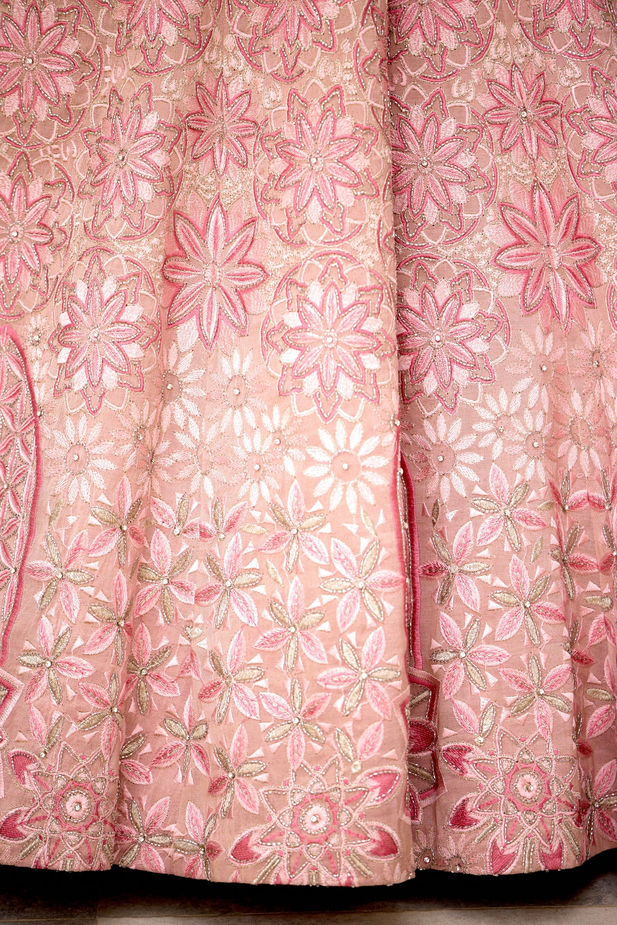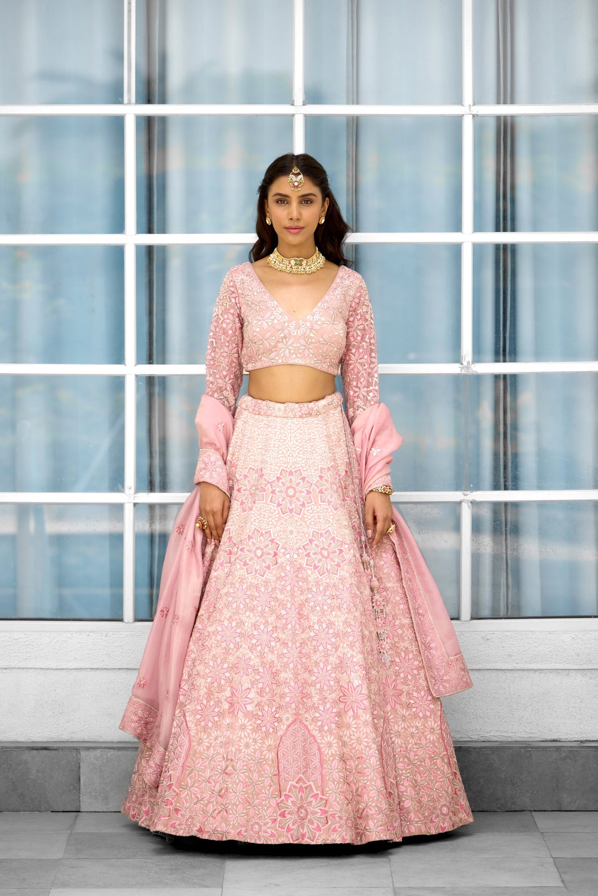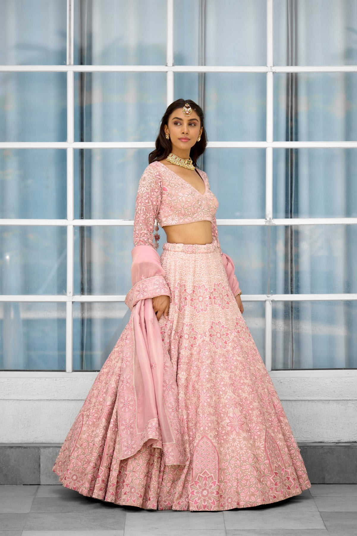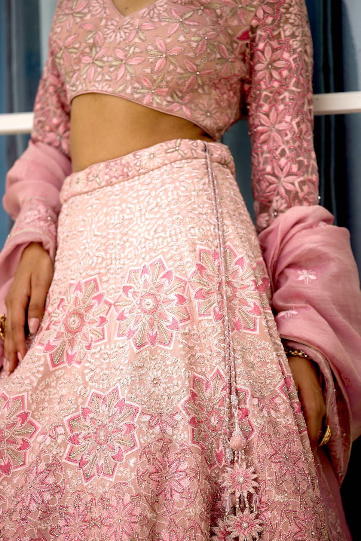 Colour: pink Garment Category : Womenswear fully hand embellished Lehenga set with blouse and dupatta a Fabric : Tissue Fit : Regular fit Washcare : Dry clean only