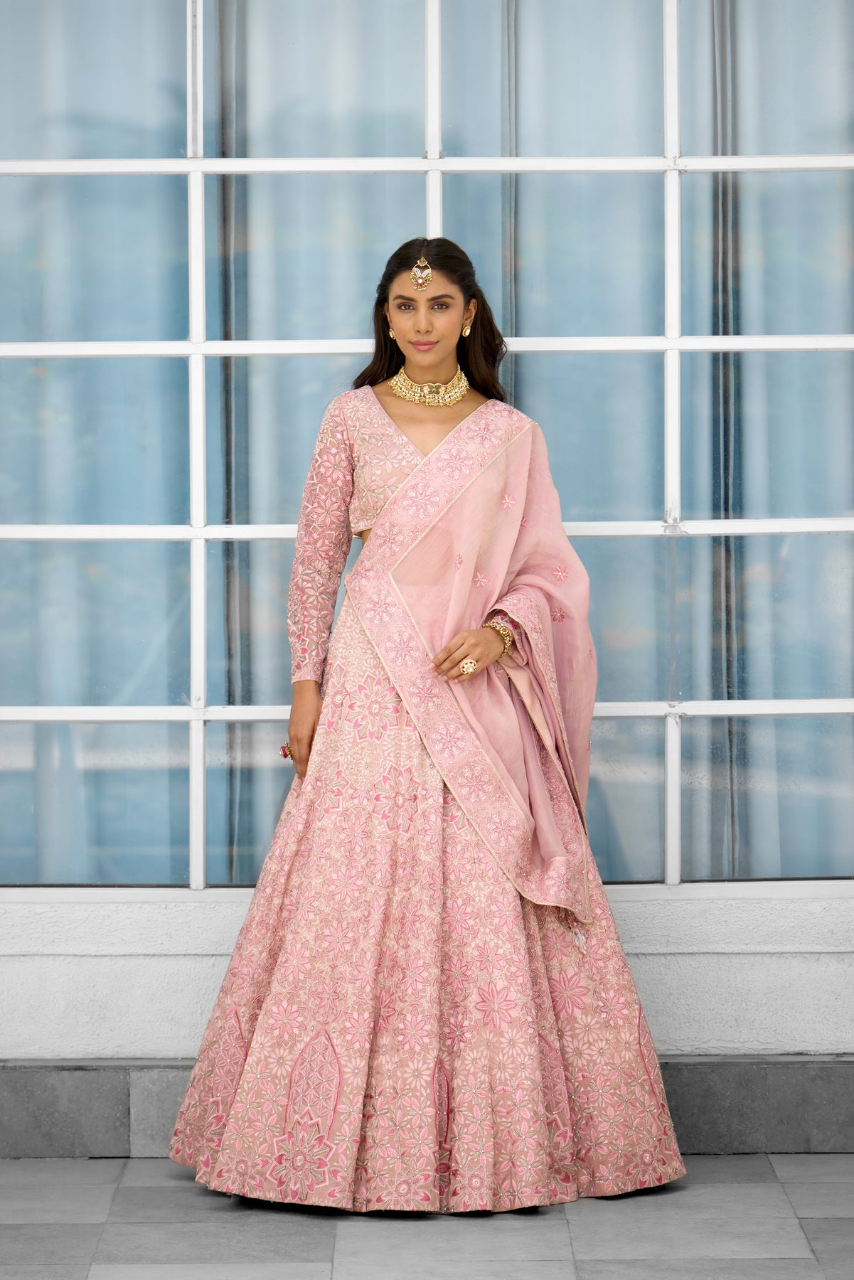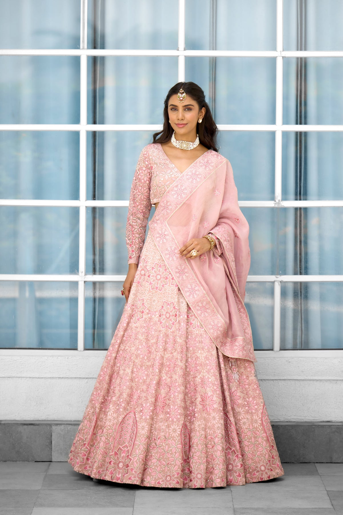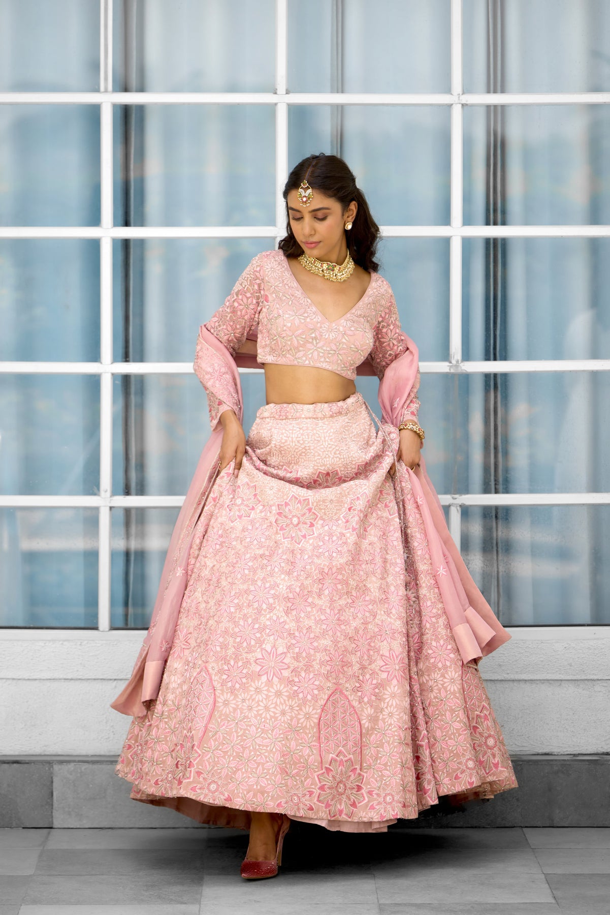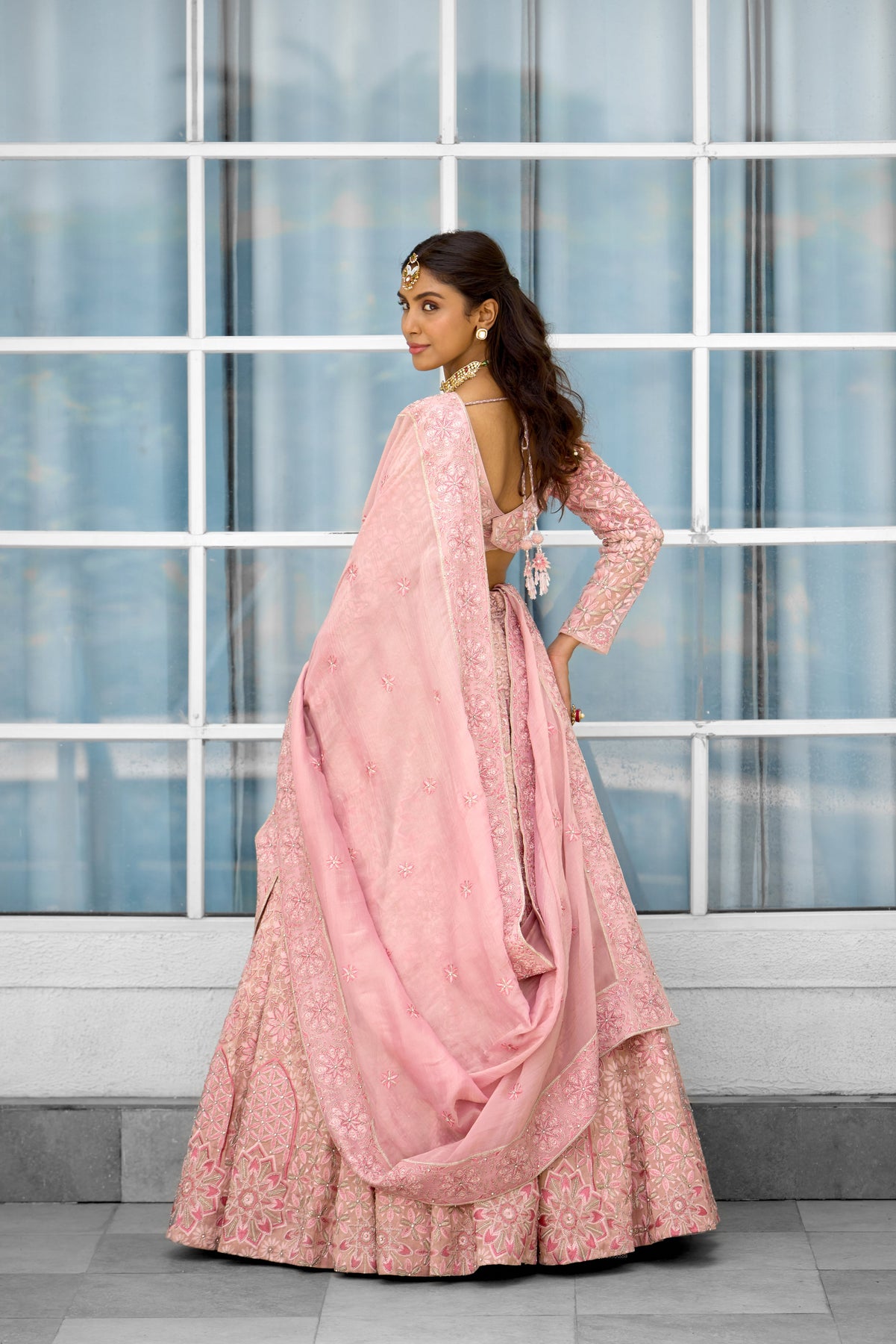 Colour: pink Garment Category : Womenswear fully hand embellished Lehenga set with blouse and dupatta a Fabric : Tissue Fit : Regular fit Washcare : Dry clean only