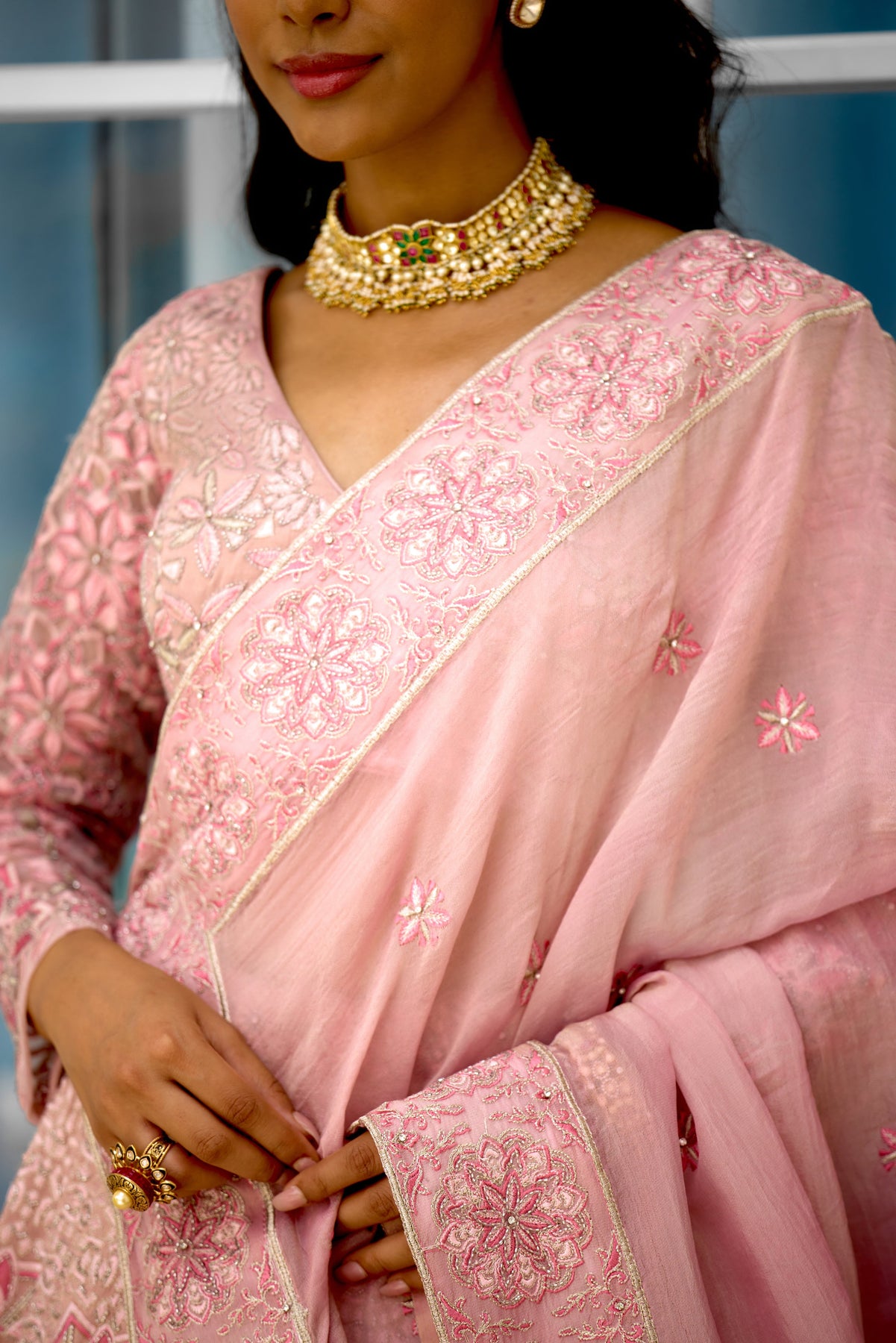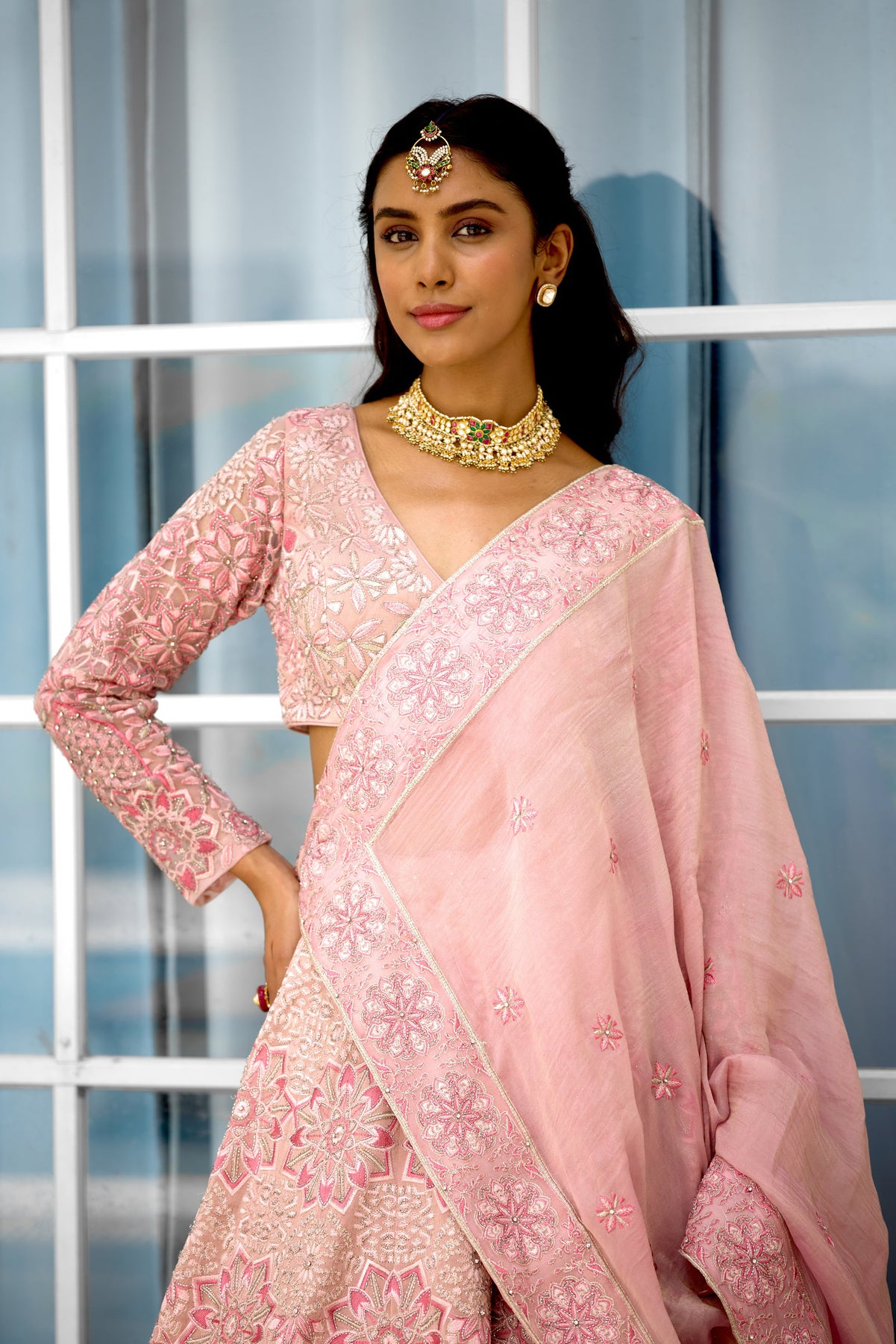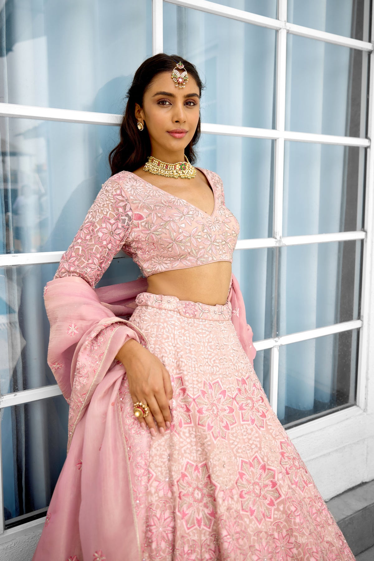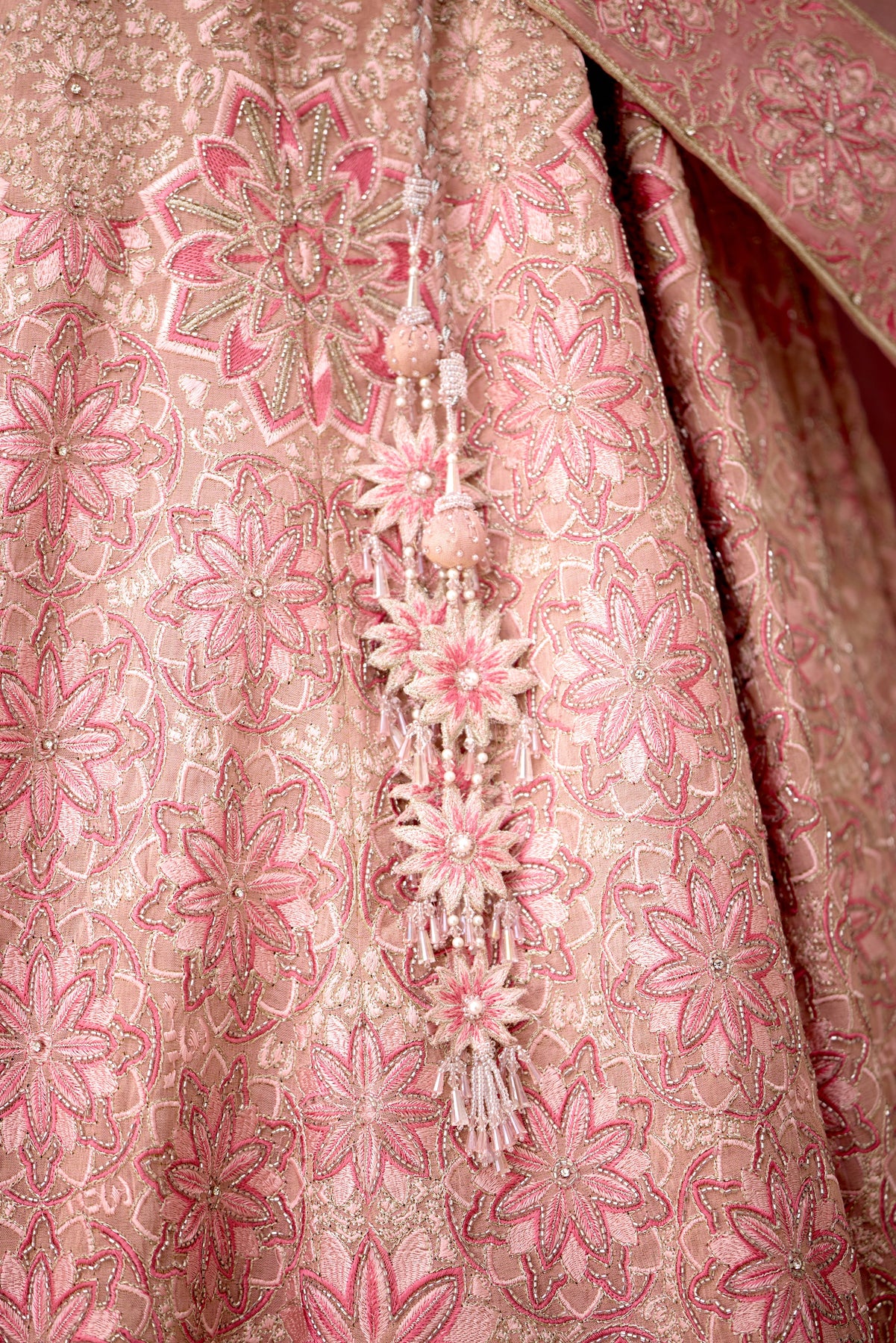 Colour: pink Garment Category : Womenswear fully hand embellished Lehenga set with blouse and dupatta a Fabric : Tissue Fit : Regular fit Washcare : Dry clean only