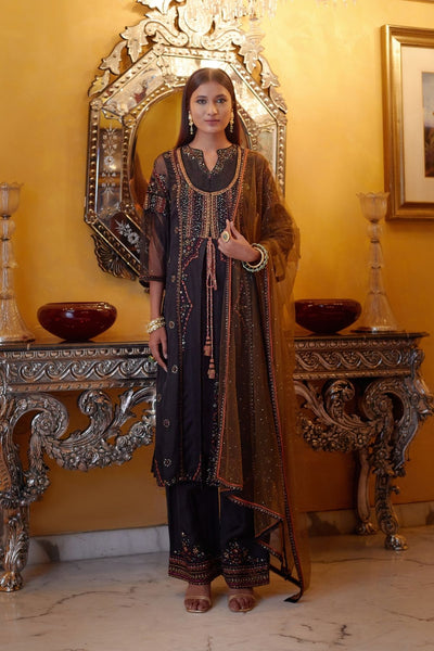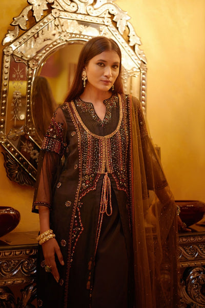 Black jacket suit with cord embroidery and multicolor thread detailing with sequins spread all over