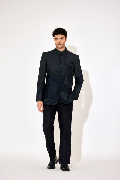 This dark green men's printed Bandgala combines traditional elegance with a modern touch. Crafted to provide a sharp, structured silhouette, its rich dark green fabric with subtle prints enhances formal and festive occasions. Designed for comfort and style, this Bandgala pairs effortlessly with tailored trousers for a distinguished, polished look. Ideal for weddings, receptions, or any formal event demanding refined attire.