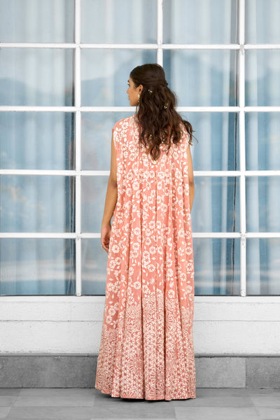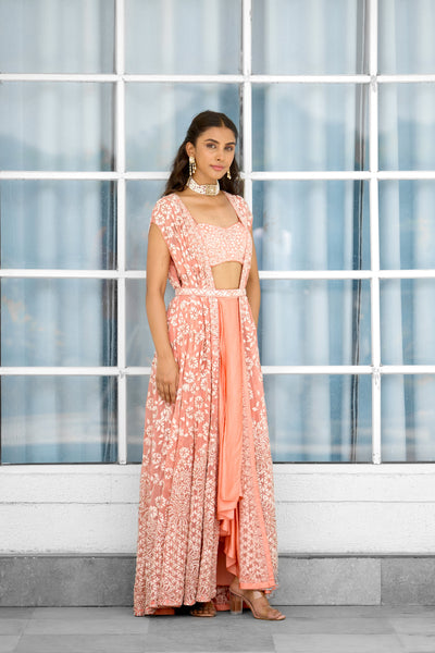 Colour : Peach pink Garment Category : Women wear Hand Embellished Cape Dhoti Blouse Set Fabric : Net + satin Fit regular fit Washcare : Dry clean only