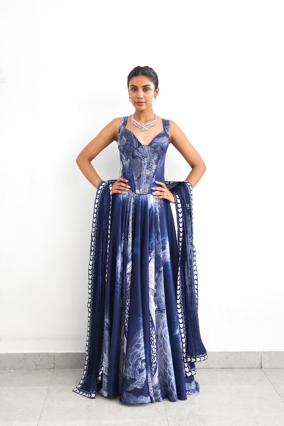 Color: Blue Garment Category: Women wear Lehenga Set with Corset blouse dupatta Fabric: Satin Silk Fit:Regular fit Washcare: Dry clean only